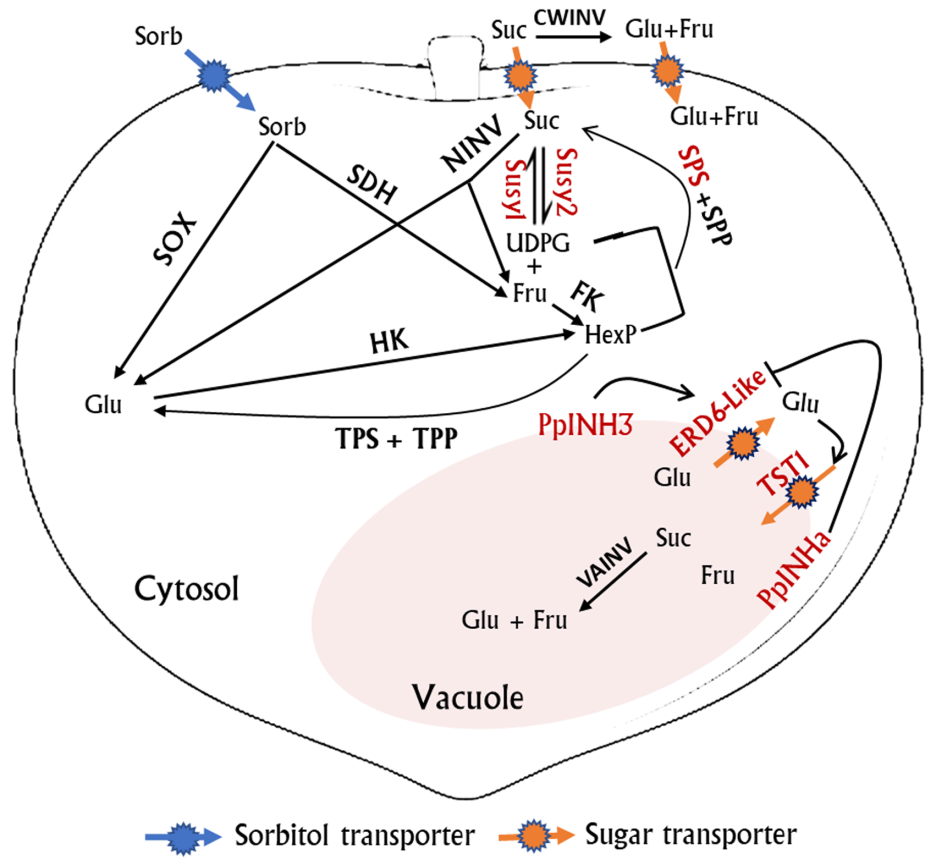 另外,本研究还发现与总糖负相关的候选基因中存在另一个蔗糖合成酶SuSy2。此外正相关基因还有两个单糖转运体PpERD6-Like1和PpERD6-Like2,它们的瞬时过表达可能会引起PpTST1的表达量发生变化。综合上述发现得出了桃的果实糖分积累的模式图(图4),发现桃的果实糖分积累既源自代谢又来自体内的源-库运输,同时还受到多种因子调节。本项研究发表于国际研究期刊Frontiers in Plant Science,受到国家自然科学基金等项目资助,论文并列第一作者为孟加拉留学生Md Dulal Ali Mollah和张娴,王鲁副研究员和韩月彭研究员为论文通讯作者。本研究揭示了桃果实糖分积累中的重要基因及其机制,为实现水果糖组分的精细化调控提供了研究实例和技术元件,在功能健康型水果开发方面开辟了新的思路。