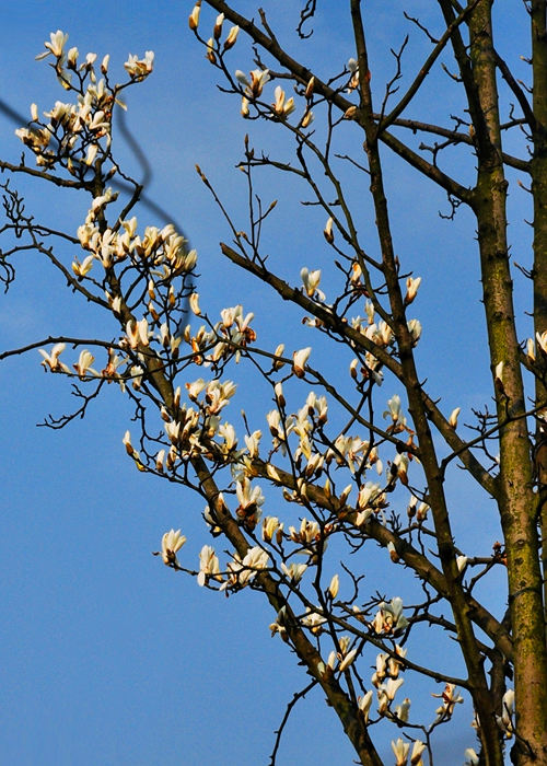 早开的白玉兰,常常受到暗霜或寒风的冻害,导致其花瓣枯吊枝头,乃至影响果实的结实。希望近日的“倒春寒”不会冻坏已经绽放的白玉兰花朵,待到晴日,让游人欣赏到它们在蓝天映衬下的、朵朵向上的洁白身姿。