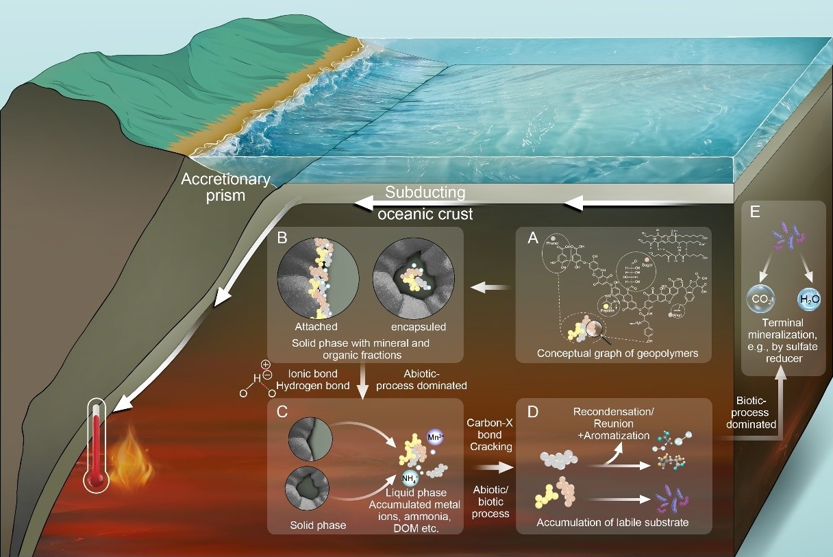 图2. 深部碳库在加热作用下的非生物与生物耦合分解模型示意图。