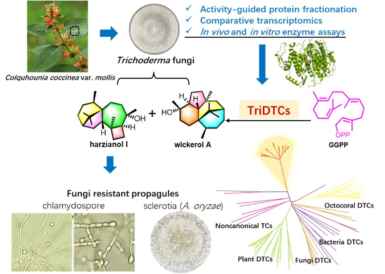 萜类化合物是天然产物中数量最庞大的家族,具有重要的生物学功能和药用价值;萜类环化酶(terpene cyclases, TCs)催化精细复杂的环化反应,生成多样化的萜类骨架,是萜类化学结构多样性的基础。中国科学院昆明植物研究所植物化学与天然药物全国重点实验室黎胜红研究团队长期致力于新颖萜类化合物的发现、生物/化学合成及生物功能研究。团队前期发现药用植物火把花(Colquhounia coccinea var. mollis)腺毛富含一类具有防御功能和抗炎免疫等活性的新颖骨架二倍半萜(命名为火把花烷)(Org. Lett. 2013, 15: 1694),并从其内生真菌深绿木霉菌(Trichoderma atroviride B7)中分离鉴定了系列抗菌活性哈茨木霉烷和木霉素二萜化合物(Phytochemistry 2020, 170: 112198)。近日,团队成功从木霉属真菌中挖掘并鉴定了一类新颖的非典型萜类环化酶,解析了木霉属特征二萜的生物合成及生物学功能。