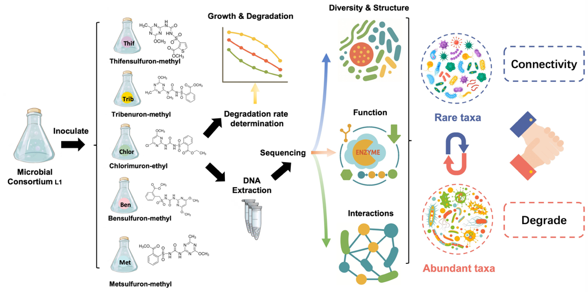 中国科学院沈阳应用生态研究所“环境污染过程与效应创新组群”徐明恺团队,长期聚焦于合成微生物组学在面源污染治理中的理论与应用研究,近期,团队针对复杂条件下复合污染土壤难以修复的瓶颈问题,以合成功能微生物组学策略,构建了具有广谱降解磺酰脲类除草剂能力的合成菌群L1,实现了除草剂复合污染的高效去除。该研究创新性的以丰富/稀有菌属视角系统解析了菌群L1在不同底物条件下的群落结构、装配机制、功能类群和微生物互作机制。研究表明,L1可高效降解氯嘧磺隆、苯磺隆、甲磺隆、苄嘧磺隆和噻吩磺隆等五种典型除草剂,展现了稳定的广谱降解能力。多组学分析结果显示,优势菌属(如 Methyloversatilis、Pseudoxanthomonas、Chitinophaga)是降解功能的核心驱动,而稀有菌属在维持网络连接和系统稳定性中发挥重要作用,且特定条件下二者可发生转换,突破了以往研究仅关注优势菌的局限。功能注释结果进一步揭示,谷胱甘肽转移酶和脲酶等关键酶在不同底物条件下表现出差异性贡献,体现了功能冗余与底物适应性并存的特征。网络分析发现菌群内部以正相关互作为主,不同底物条件下的互作强度和复杂性显著增强,揭示了底物复杂性对菌群自适应和稳健性的驱动效应。这些结果不仅深化了对广谱降解菌群功能机制的理解,也凸显了稀有类群与优势类群协同作用在维持群落稳态和功能多样性中的关键意义,为合成功能菌群的理性构建及精准应用提供了新的理论框架和技术路径。