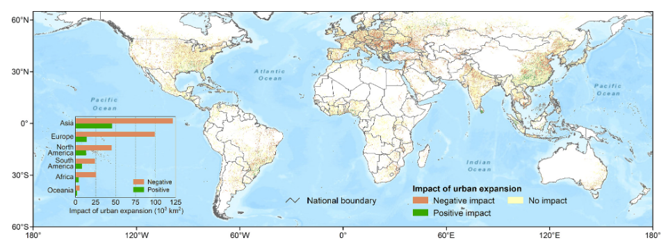 基于GAIA、GUB和NEP数据,团队对全球2904个城市进行了跨边界分析,揭示城市扩张对植被NEP空间差异的影响机制。研究发现:城市内部不同区域NEP年际变化差异显著。发达国家城市NEP整体上升,可能得益于生态修复与绿化政策;而发展中国家城市,尤其是新城区和郊区,NEP受扩张干扰较大。城市扩张对外围区域NEP的影响范围随城市规模增加而扩大,特大城市可达70–80 km,中小城市为30–40 km。全球范围内,城市扩张导致的负向影响区域约32.04万 km²,正向影响区域为8.67万 km²,且不同规模城市的主导影响因素存在显著差异。
