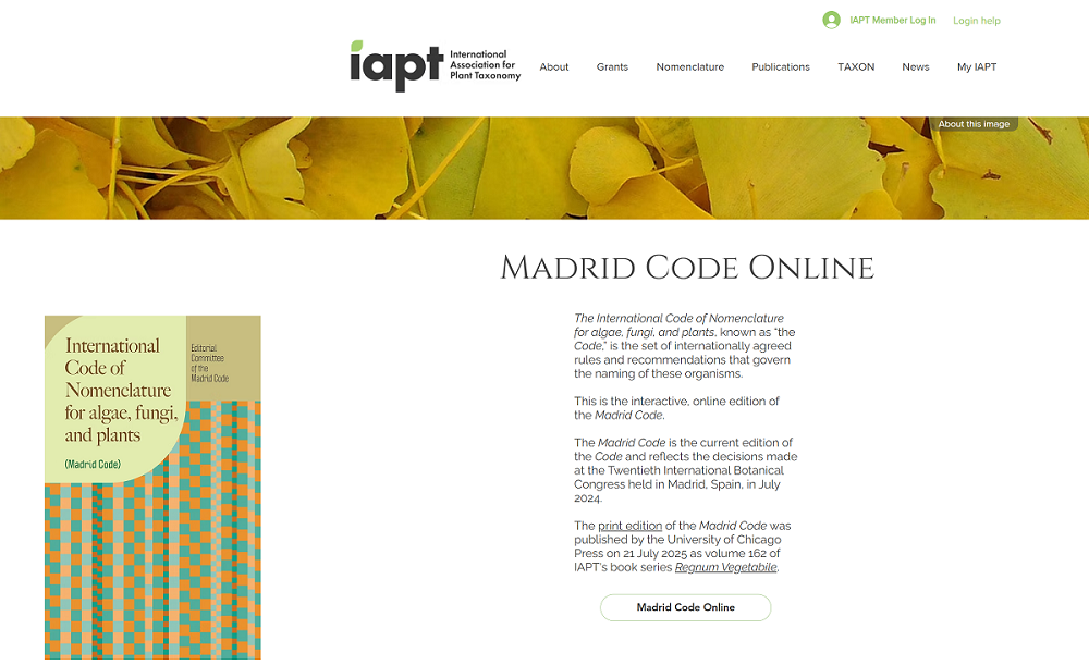 2025年7月,新版《国际藻类、菌物和植物命名法规》(International Code of Nomenclature for algae, fungi, and plants (Madrid Code) 简称ICN)(即《马德里法规》)已由美国芝加哥大学出版社出版发行。《马德里法规》作为国际植物分类学会(IAPT)的旗舰连续出版物Regnum Vegetabile(《植物界》)第162卷,是 2024 年 7 月在西班牙马德里召开的第 20 届国际植物学大会命名法分会讨论修订,并经大会批准的最新版本,取代 2017 年7月第 19 届国际植物学大会(中国深圳)批准,2018年由Koeltz Botanical Books出版的《植物界》第159卷的《深圳法规》。近日,《马德里法规》电子版已在国际植物分类学会(IAPT)官网正式在线(https://www.iaptglobal.org/madrid-code-online),供全球植物学、菌物学和藻类学及相关学科科研人员免费查阅。
