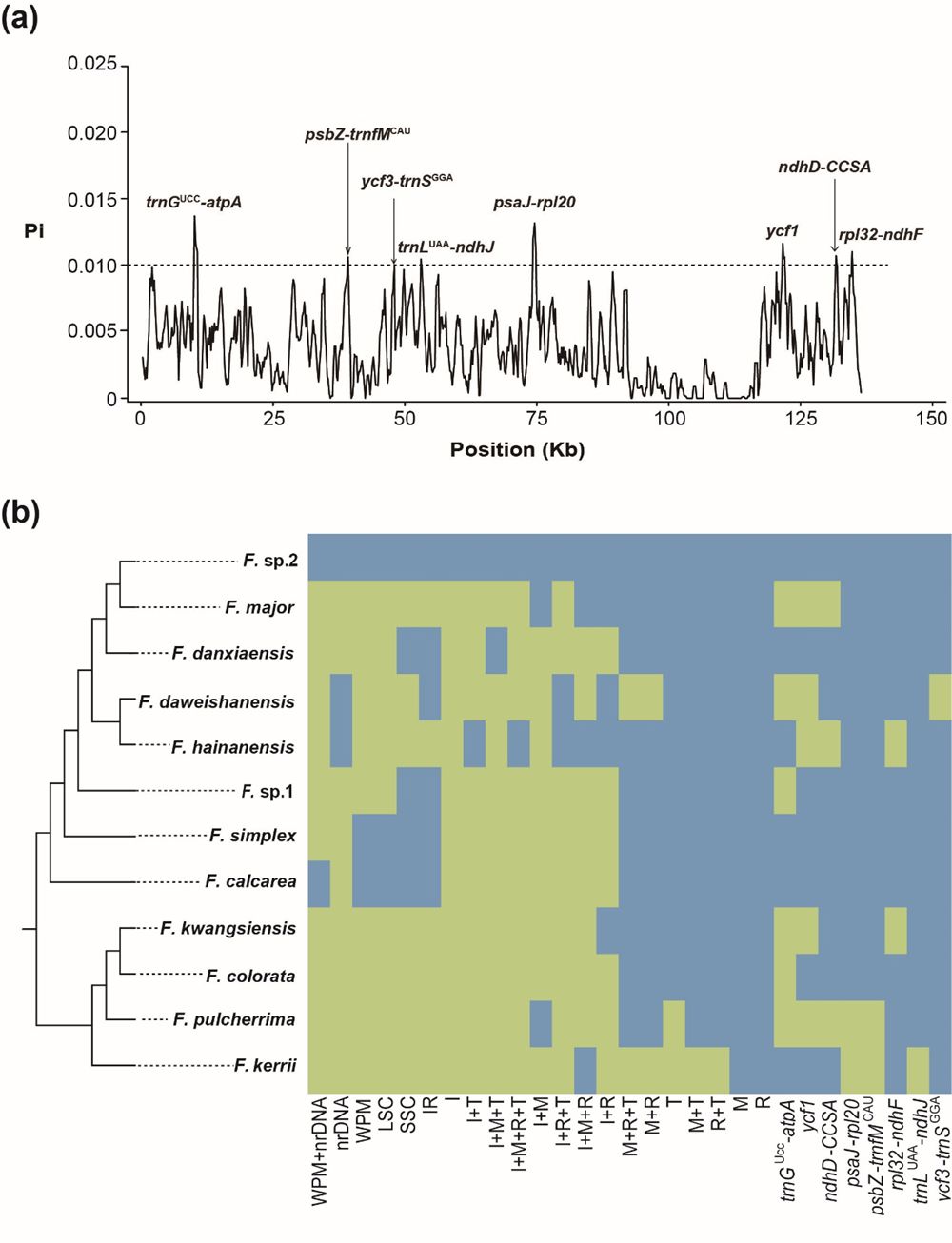 图2.(a)基于叶绿体基因组核苷酸多态性识别出的八个高变区域;(b)采用最大似然法建树对上述高变区域与六个DNA超级条形码(WPM + nrDNA、nrDNA、WPM、LSC、SSC、IR)、四个植物DNA通用条形码(nrITS(I)、matK(M)、rbcL(R)、trnH-psbA(T))及其所有可能的组合进行物种鉴定效率比较。绿色代表鉴定成功,蓝色代表鉴定失败。