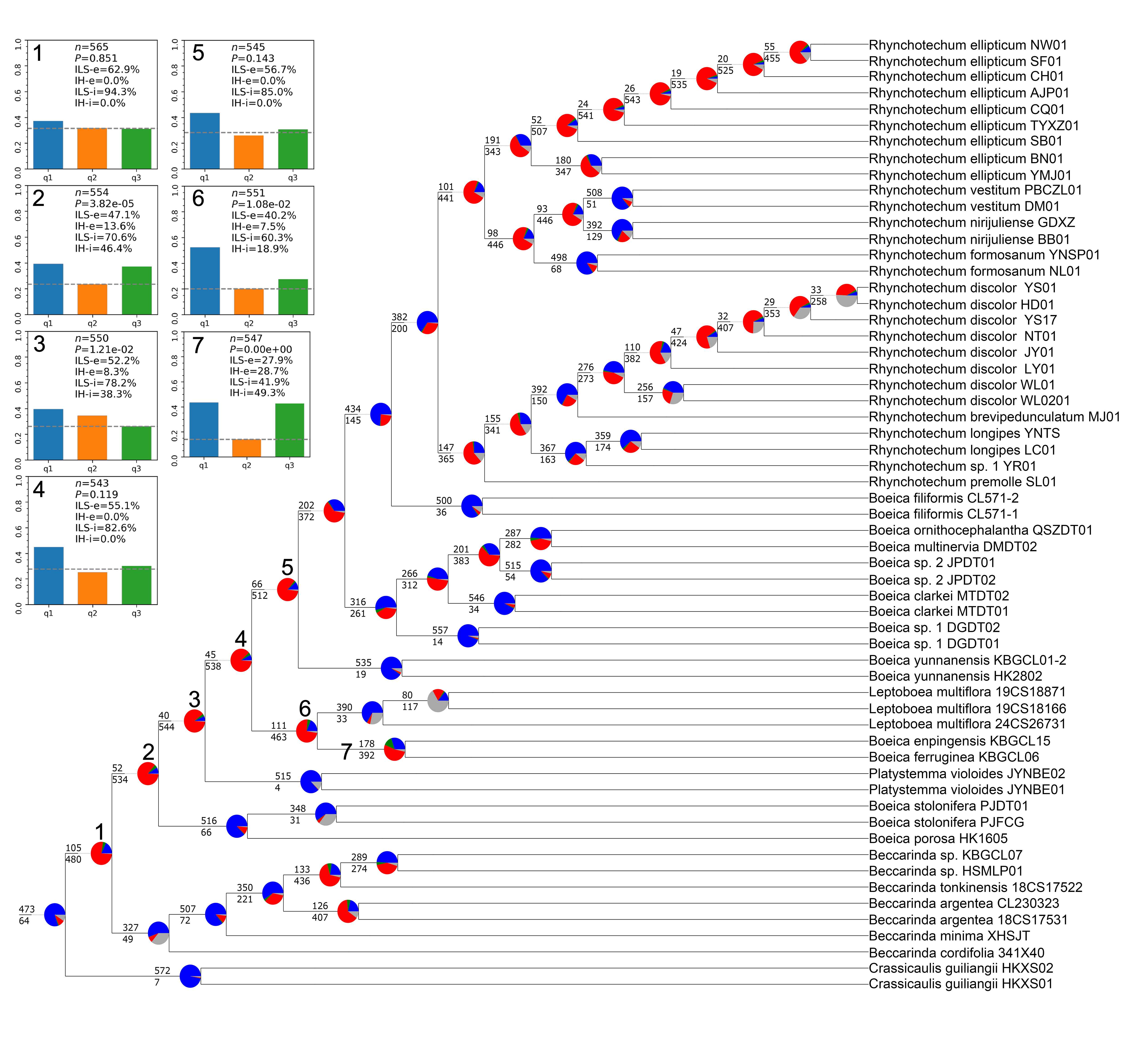 图2 检测与解析基因树不一致性:通过可视化核基因树与物种树在各节点的拓扑冲突(采用Phyparts分析量化)。左上插图展示了对七个存在显著基因树不一致性的属级分支进行的phytop系统发育冲突分析结果。
