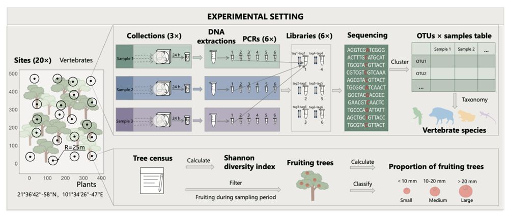 该研究成果以 Airborne eDNA reveals resource-based assembly of frugivorous vertebrates 为题,近期发表于国际分子生态学期刊Molecular Ecology Resources上。版纳植物园森林生态系统结构、功能与动态研究组博士后蔡望为第一作者,杨洁研究员为通讯作者;云南大学联培硕士研究生李云翱、昆明动物研究所生物多样性基因组中心杨春燕副高级工程师为该论文共同第一作者。研究得到中国博士后科学基金、云南省“彩云博士后”计划、版纳植物园“十四五”科技创新规划及中美生物多样性合作研究项目等资助。