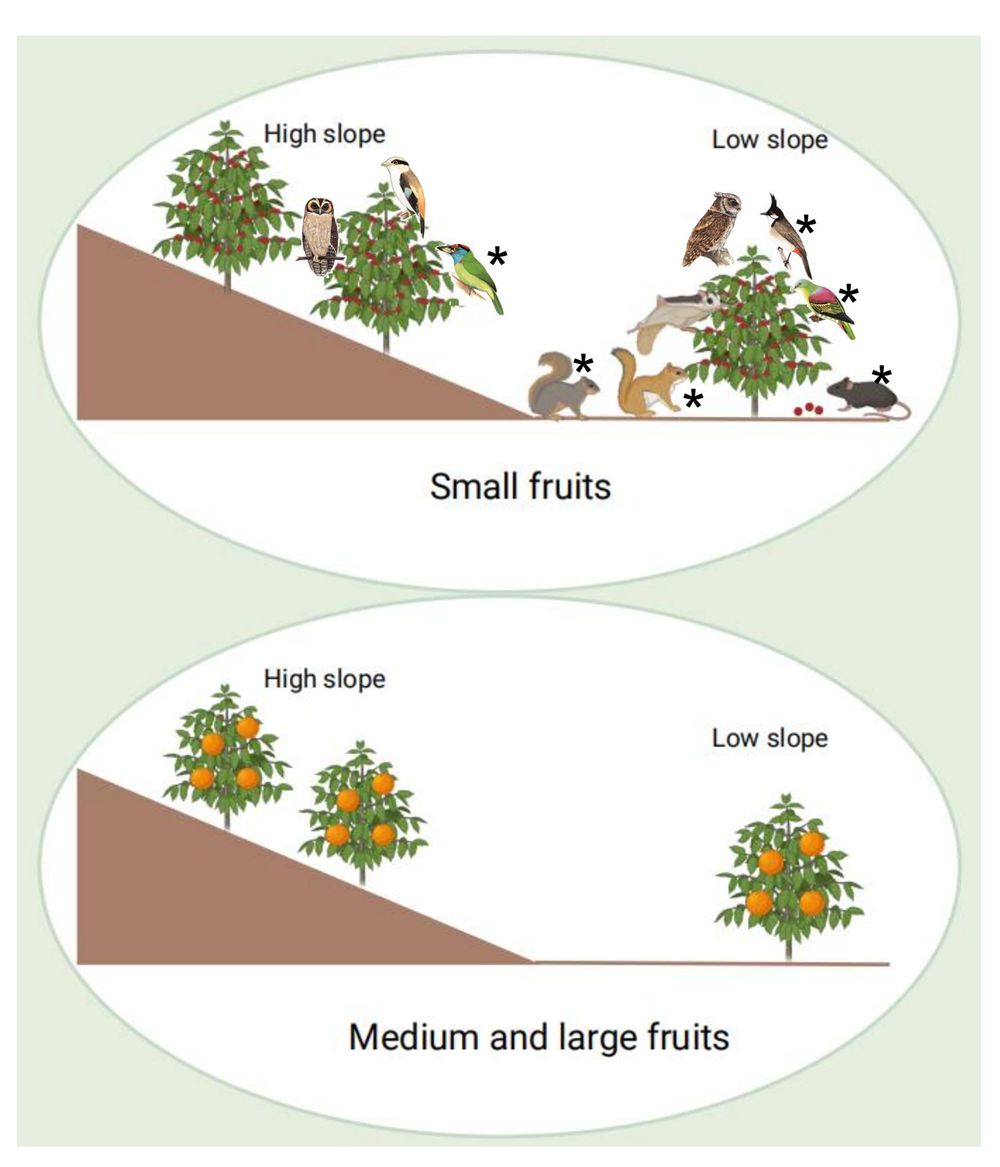 通过在样地内布设20台空气采样器,收集空气中的DNA,并通过高通量测序获取其中的脊椎动物遗传信息。在为期6天、3轮的采样中,共检测到89种陆生脊椎动物,其中包括71种鸟类和18种哺乳动物。研究结果表明,样地内果树数量和果实大小对食果动物的空间分布具有显著影响:果实资源越丰富的区域,食果鸟类和哺乳动物的出现概率越高;尤其是小果树(果实直径小于10毫米)的分布,对小型鸟类和松鼠等小型哺乳动物的分布起着重要的驱动作用。相比之下,食肉动物的分布与果实资源并无明显关联。