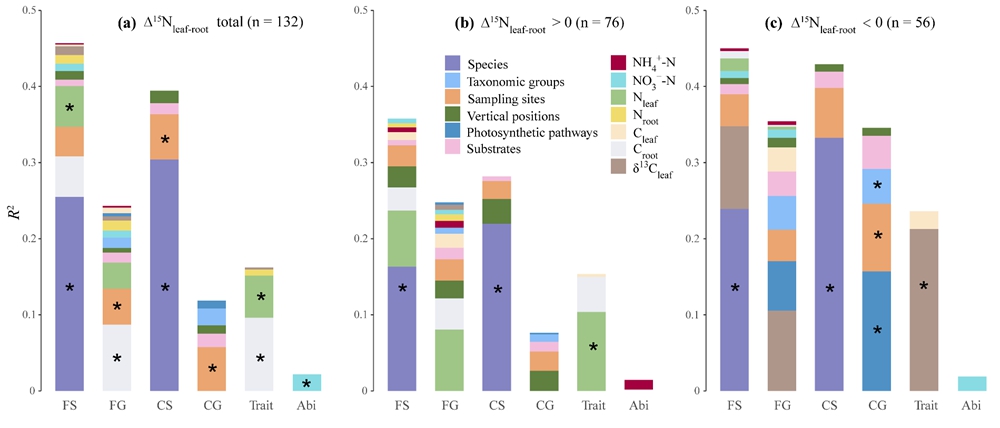 中国科学院西双版纳热带植物园(以下简称“版纳植物园”)研究团队在云南西双版纳热带地区不同生境(版纳植物园、勐仑镇、213国道沿线和银厂)中,采集了涵盖多个类群的24种附生维管植物的叶片和根系材料,测定其C、N含量及δ13C、δ15N,系统回答了上述科学问题。结果表明:1)附生维管植物叶-根间15N分馏效应(+0.43‰)较小,与地生植物(2‰)相比,反映了森林冠层比地面生境存在更严重的N限制; 2)附生植物的叶-根15N分馏在不同分组间保持相对一致,但具有显著的物种特异性,且与系统发育无显著相关,反映了外部N源及其N获取策略的综合影响; 3)附生植物的叶-根15N正分馏主要与叶片N、根C相关,而负分馏与叶片δ13C相关,暗示不同因素(如外部氮源、水分亏缺和氮获取策略)驱动着其体内15N分馏过程。