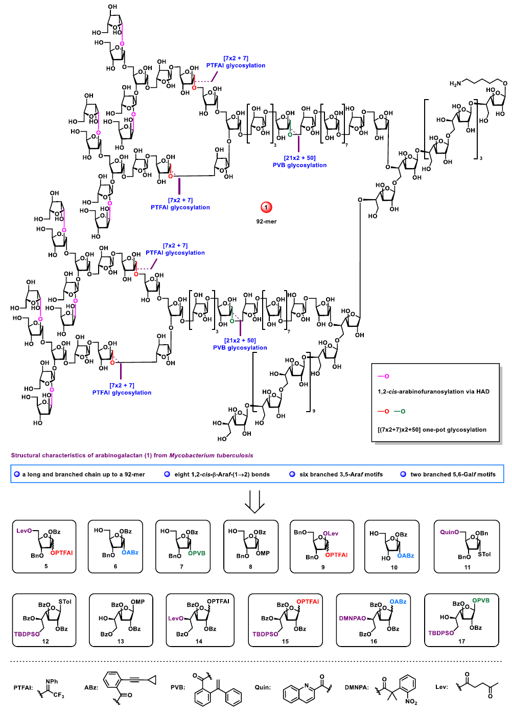 结核分枝杆菌表面覆盖着一层厚厚的蜡状细胞壁,从而对化学治疗药物的进入形成了一个巨大的和复杂的屏障。抑制细胞壁的生物合成是目前一些成功的一线药物的主要作用机制。阿拉伯半乳聚糖(AG)是结核分枝杆菌细胞壁的主要成分之一,是研发治疗结核病的药物、疫苗和诊断方法的重要分子。最近,中国科学院昆明植物研究所植物化学与天然药物全国重点实验室肖国志专题组通过基于糖基邻(1-苯基乙烯基)苯甲酸脂(PVB)的正交一锅糖苷化反应策略(Acc. Chem. Res. 2025,58, 2350),模块化高效合成结核分枝杆菌阿拉伯半乳聚糖92糖1(图1)。同时,子结构多糖序列14糖2,30糖3和50糖4也被合成用于构效关系研究。使用分子动力学模拟和核磁共振光谱进行构象分析,以及在人体细胞模型中对阿拉伯半乳聚糖1–4的免疫学研究表明,表面暴露的30糖3仅引发适度的 NF-κB激活,同时保持细胞活力。