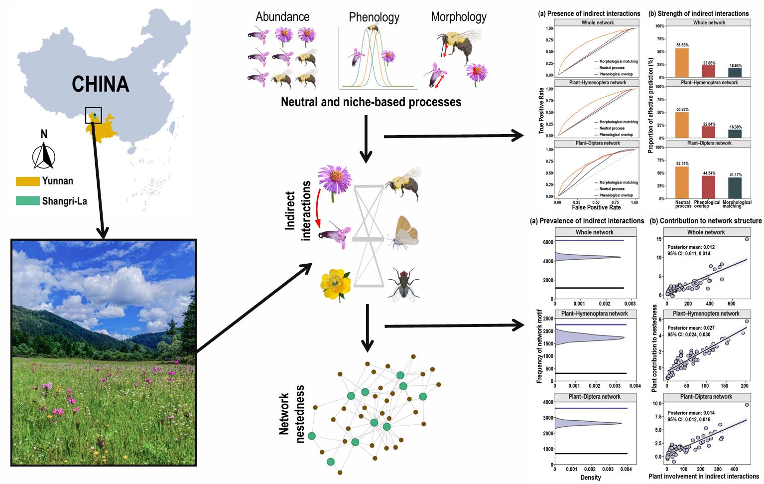 为解答这一生态学谜题,中国科学院武汉植物园植物繁殖生态学团队在香格里拉县选取了一个具有120余种虫媒开花植物的高山草甸群落开展深入研究,结果揭示了隐藏在传粉网络中的植物间间接相互作用及其作用机制(图2)。研究团队收集了近7000次昆虫访花记录,测量了93种焦点植物和258种传粉昆虫的功能性状,并系统构建了膜翅目和双翅目传粉者网络,以及涵盖所有植物和传粉者的整体网络。