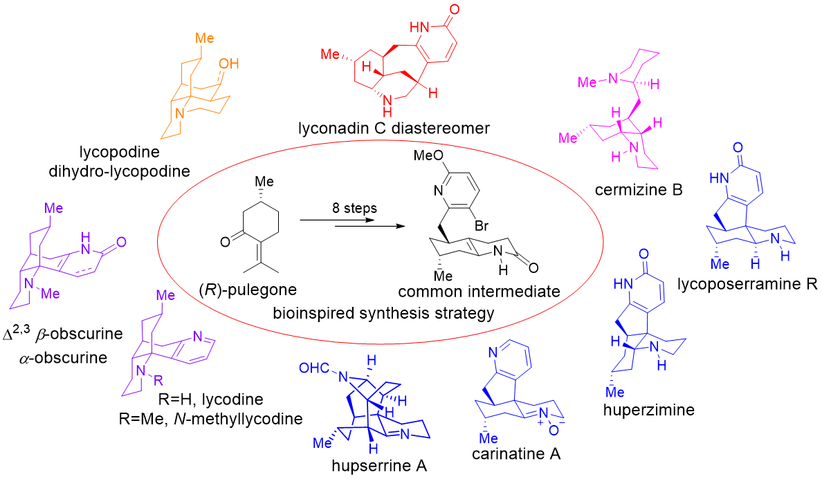 石松生物碱(Lycopodium alkaloids)是存在于石松科植物中的特征性成分,具有结构多样性和复杂性的特点。这类生物碱是药物发现的重要资源,其中石杉碱甲(Huperzine A)作为石松生物碱的典型代表分子,具有选择性乙酰胆碱酯酶抑制活性,在临床上用于治疗中轻度阿尔茨海默病(Alzheimer's disease)。鉴于我国石松类植物资源丰富,为持续发掘石松生物碱新结构、发现新的药物先导分子,中国科学院昆明植物研究所植物化学与天然药物全国重点实验室赵勤实研究团队多年来致力于石松生物碱的研究,已成功发现多种结构新颖、活性优良的化合物,并在CCS Chemistry、Organic Letters、Chemical Communications、Organic Chemistry Frontiers以及Bioorganic Chemistry等国际知名学术期刊上发表了系列研究论文。然而,石松生物碱在植物资源中含量极低,限制了石松生物碱活性研究和进一步药物发现,如何通过化学全合成方法打破石松生物碱资源匮乏困境成为亟待解决的科学问题。赵勤实研究团队在此领域取得了显著进展,他们先后对(±)-Cermizine B(J. Org. Chem. 2017, 82, 11110)、Huperserratine A和B(Org. Chem. Front, 2022, 9 , 3664),以及Phlegmine A(CCS Chem. 2024, 6, 2529)开展了全合成研究,为石松生物碱的资源开发利用和药物发现提供了基础。