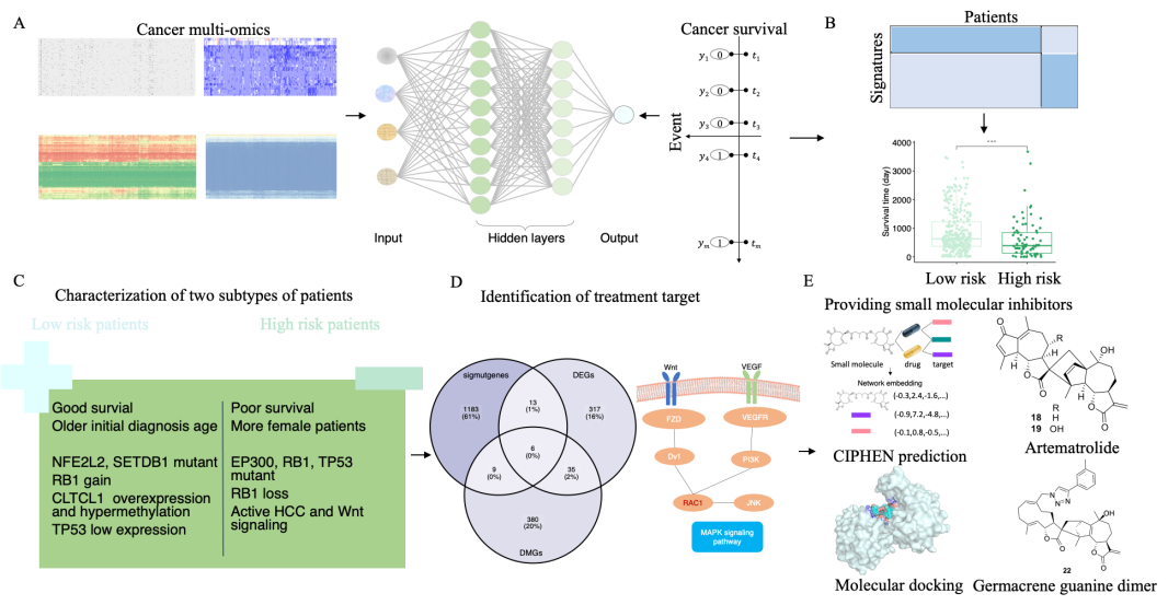 基于深度学习的多模态模型能够高效挖掘肿瘤多组学数据揭示新的治疗靶点。团队提出DLCP模型,通过对肿瘤多组学数据与患者生存信息的高效整合,实现了对肝细胞癌患者的分子分型、预后生物标志物识别并推荐了潜在的抗肝癌优势分子。DLCP实现了肝癌高、低危患者的分子分型,筛选到预后生物标志物Rac 家族成员RAC1。通过分子对接、动力学模拟及课题组前期开发的基于深度学习的化合物靶点预测模型CIPHEN,DLCP模型成功筛选到倍半萜二聚体衍生物KGA-1083b。实验表明KGA-1083b对三株肝癌细胞(SK-Hep-1,HepG2,Huh7)均显示出显著抑制活性,IC50均低于10 μM, SPR 实验获得KD 值17.3 μM,CETSA实验表明 KGA-1083b 可以使得RAC1 的热稳定性增加。综上, DLCP 为将深度学习应用于癌症预后分析方面提供了一个成功的范例,它通过整合多样化的多组学数据和临床表型揭示了肝细胞癌发展的分子机制,加速了候选药物分子的发现。