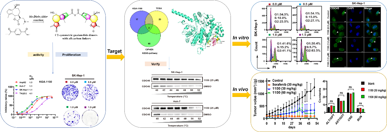 将倍半萜单体进行“二聚体化”修饰是提升其抗肝癌活性的有效策略。研究团队以蒿属植物中的高含量倍半萜arglabin为底物,通过双Diels-Alder反应,设计合成了一系列通过碳链连接的二聚体,这些二聚体均具有较好的抗肝癌活性,特别是KGA-1100抗肝癌活性较arglabin提升30余倍。通过生物信息学分析结合多种实验验证,首次发现并证实细胞分裂周期蛋白45(CDC45)是KGA-1100的作用靶点。机制研究表明,该化合物通过靶向CDC45将细胞周期阻滞在G2/M期,进而诱导细胞凋亡,同时有效抑制肝癌细胞的迁移和侵袭能力。在动物模型中,KGA-1100体内抗肿瘤效果显著,并具有良好的体内安全性,为后续开发提供了重要依据。
