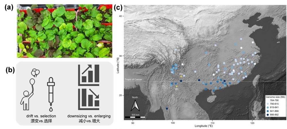 图1 (a)蔊菜实验照片;(b)基因组大小变异假说;(c)蔊菜基因组大小分布格局