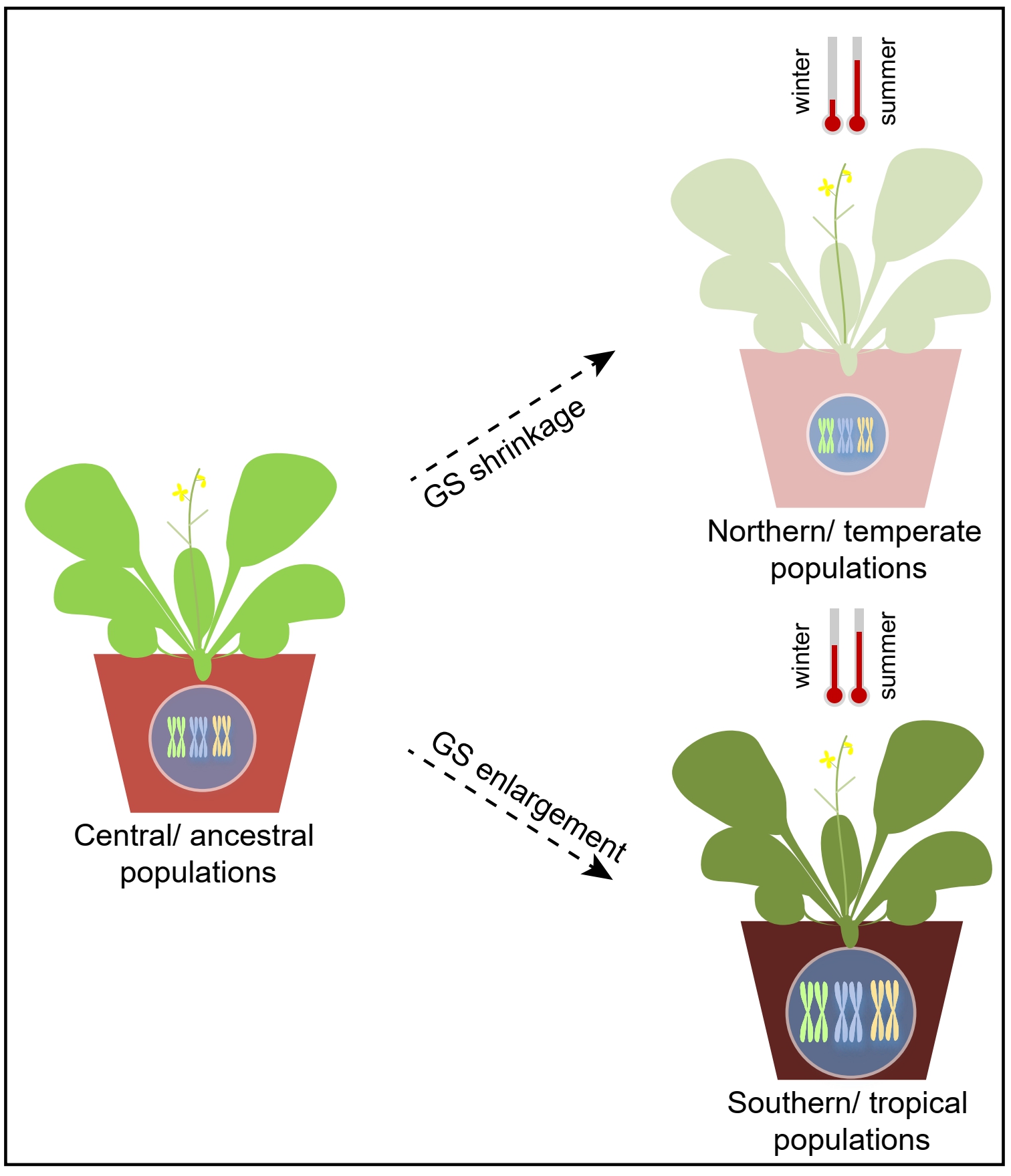 基因组大小(即单倍体细胞内核DNA总量,亦称“C值”)在生物界差异悬殊,其成因与演化意义是长期困扰学界的“C值悖论”之谜,并被《科学》列为125个前沿科学难题之一。该悖论的核心在于:基因组大小与生物复杂性无关,而传统的重复序列积累的观点,虽能解释变异的物质基础,却无法阐明其背后的演化动因与生态逻辑。在种间层面,既有观点认为存在针对大基因组的负选择压力,限制其无限扩张;亦有假说提出“大则不同”(“bigger is different”),暗示基因组扩大本身可能具有适应性意义。然而,这些争论尚缺乏种内水平的实证支撑,基因组大小变异的驱动因素与生态后果仍不明确。