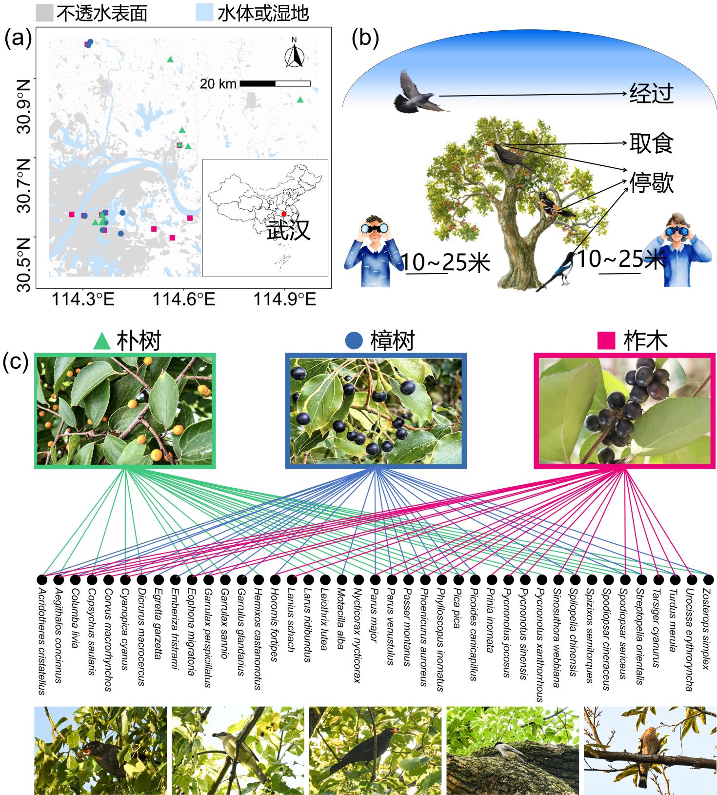武汉植物园宏观生态学研究团队根据武汉市人民政府公布的《武汉市古树名录》,从相对自然的郊野到最繁华的市中心,选取了30棵具有代表性的大型古树,包含樟树、朴树和柞木三个树种,在秋季果实成熟期围绕这些大树进行鸟类经过、停歇和取食的行为观察。