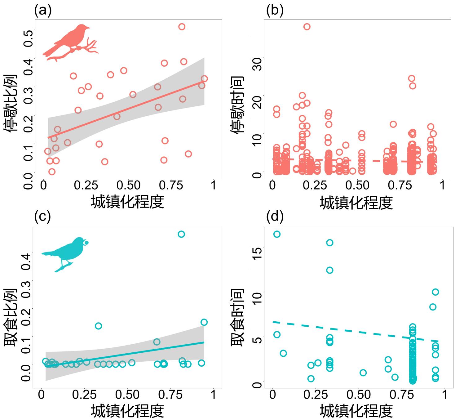 为了验证城市大树对鸟类的庇护功能,并厘清动植物互作随城镇化程度的变化规律,我们提出了递进的科学假说:尽管在高度城镇化区域鸟类多样性下降,但鸟类对大树的利用率随着城镇化程度的加剧而提高。
