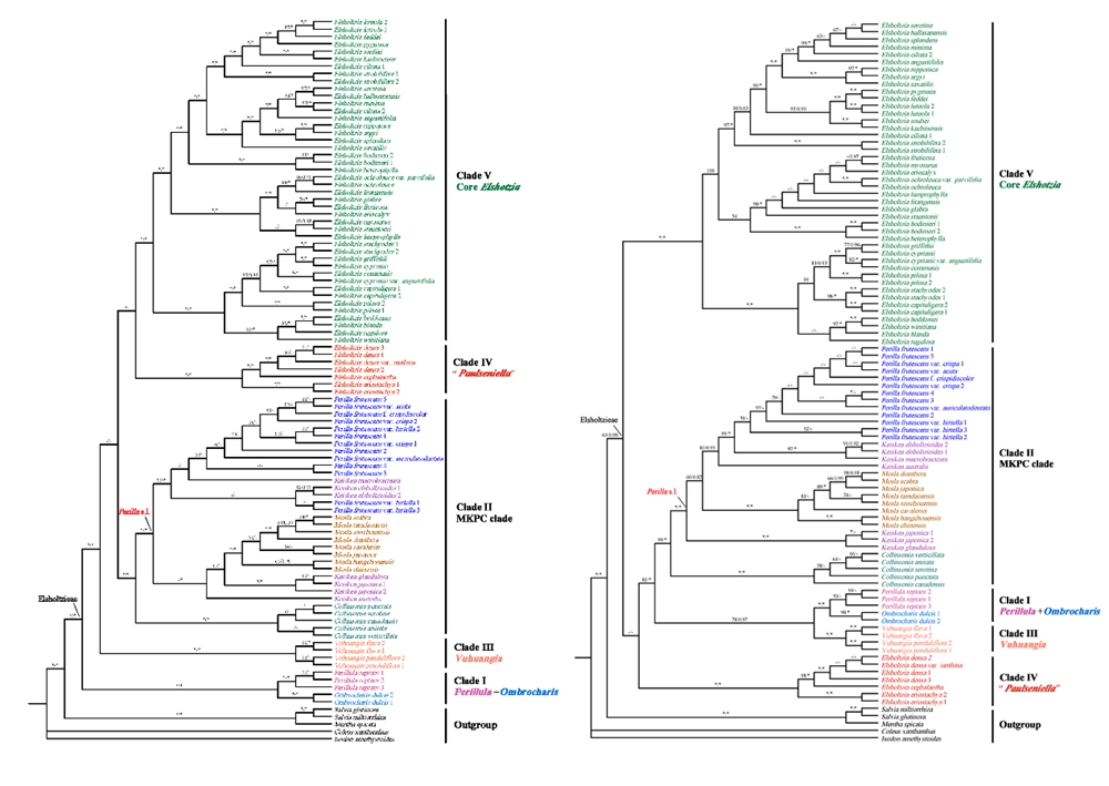 该研究是继研究团队首次明确香薷族界限(Chen et al. 2016,Taxon)和其系统位置(Li et al.,2016,Scientific Reports)后,在该族系统分类学研究上取得的又一重要进展,不仅厘清了族内各属的界限,还编制了反映最新分类系统的分属检索表,并提供了密花香薷属和紫苏属的全球物种名录。相关成果以Two in,one out: a comprehensive phylogeny of the tribe Elsholtzieae (Nepetoideae,Lamiaceae) sheds new light on its generic delimitation为题发表在国际植物分类协会会刊Taxon上。版纳植物园李波研究员为论文第一作者,中国科学院昆明植物研究所向春雷研究员为通讯作者。研究工作得到了科技部科技基础资源调查专项、国家自然科学基金及中国科学院国际合作伙伴计划等项目的资助。