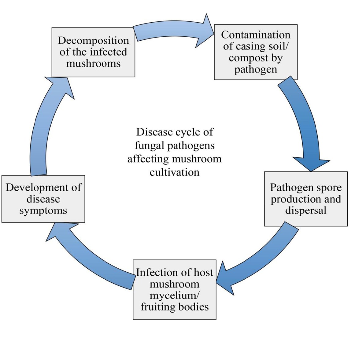 当前,蘑菇病害的管理主要依赖于综合防控措施,包括改进卫生条件、选择抗病品种、控制病媒以及使用植物检疫产品如杀菌剂等。然而,随着对有机产品需求的增长以及抗性病原真菌菌株的出现,业界迫切需要创新和可持续的作物保护策略。为减少对杀菌剂的依赖,研究人员正在探索环境友好的替代方案,如芳香植物提取物、堆肥茶以及利用特定细菌菌株的生物防控技术。