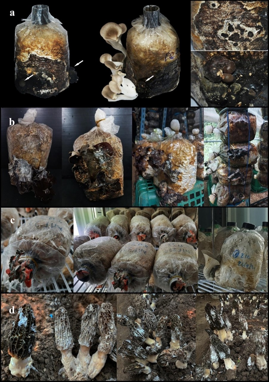 c 被青霉菌污染的平菇栽培菇体。 d 受长孢假双孢霉感染的羊肚菌