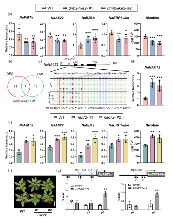 为揭示突变体尼古丁减少的原因,该研究通过全基因组重亚硫酸氢盐测序(WGBS)和RNA测序,在14个差异甲基化的转录因子与72个差异表达的转录因子中筛选到一个共有基因——NaNAC72。在突变体中其启动子甲基化升高,同时表达量升高3倍以上。共表达分析显示,NaNAC72与根特异性表达的尼古丁相关基因呈强负相关。