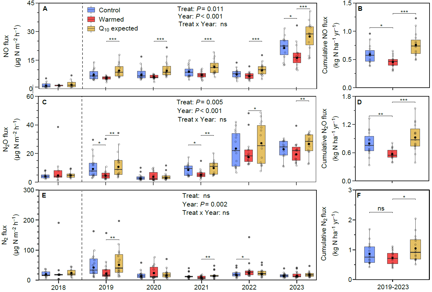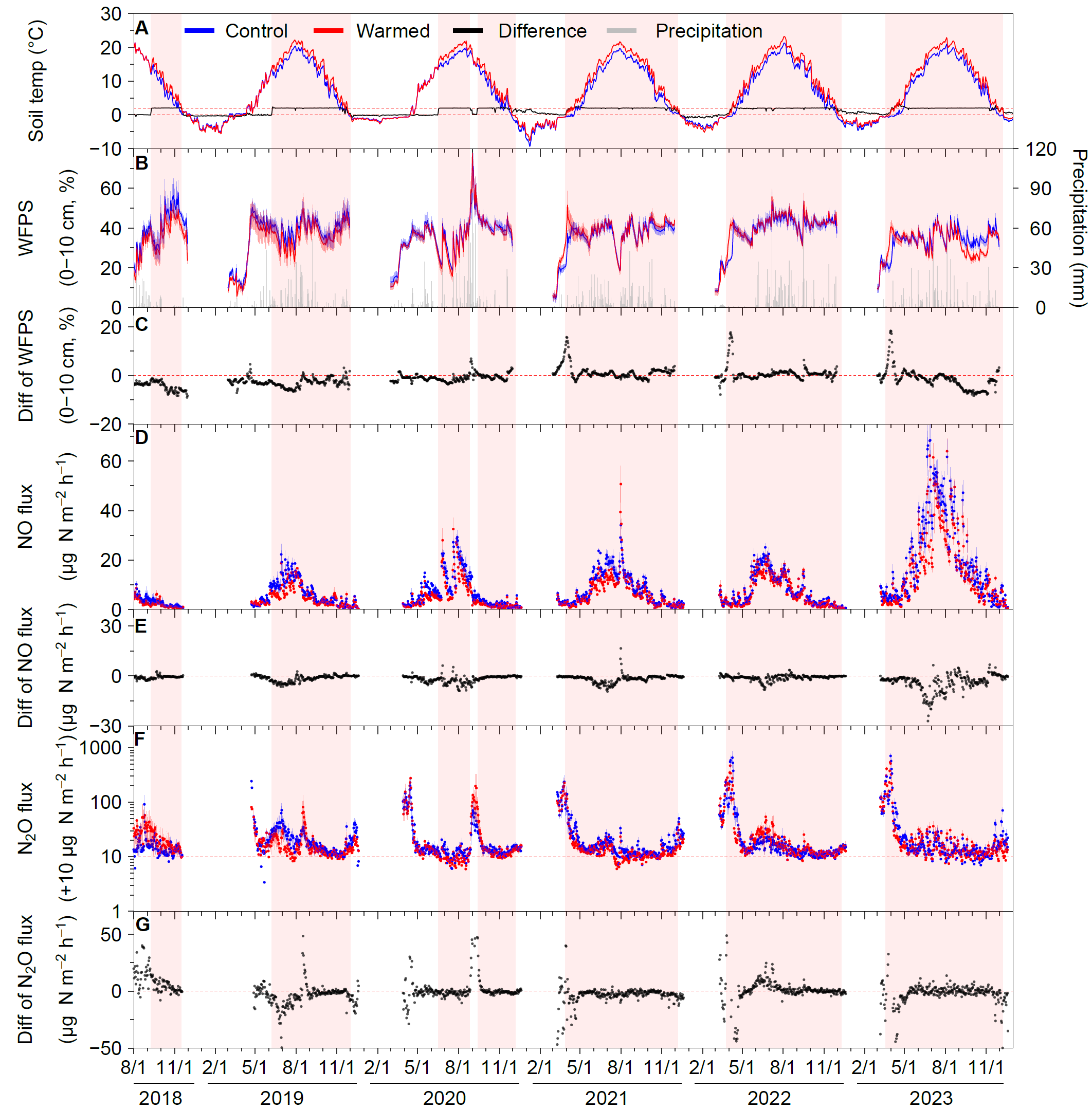 氮(N)是植物初级生产力和森林碳固存能力的关键限制性营养元素,全球变暖预测将通过气态途径加速森林生态系统N损失,从而降低N可利用性。森林土壤气态氮排放主要包括一氧化氮(NO)、氧化亚氮(N2O)和氮气(N2),其总量可占森林大气氮输入的一半。目前,大多数模型对土壤氮排放的温度响应预测仍基于实验室热力学理论(如阿伦尼乌斯方程),认为氮排放速率随温度呈指数上升。然而,这类理论缺乏长期、原位的实地验证。迄今为止,全球有10个森林生态系统开展了原位N2O排放的增温研究,而针对NO和N2的野外观测仍是空白,这使得增温情景下气态氮排放的整体响应及其机制尚未得到系统厘清。气温升高通过直接改变微生物代谢速率及间接影响土壤水分共同调控气态氮排放。因此,开展长期野外增温的高频观测对于揭示温度与水分对土壤氮循环的耦合控制机制、提高陆地碳氮循环模型的预测能力具有重要科学意义。