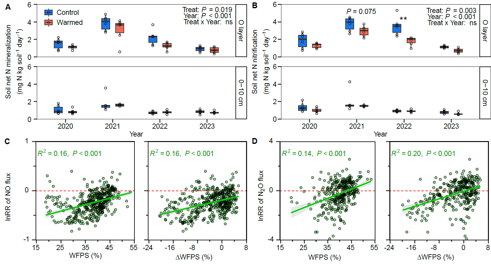 该研究成果以“Climate warming reduces soil gaseous nitrogen losses in a temperate forest”为题在2025年11月24日发表在PNAS期刊。沈阳生态所特别研究助理黄凯和吴迪研究员为共同第一作者,方运霆研究员和美国加州大学河滨分校Peter M. Homyak副教授为共同通讯作者。合作者还有挪威生命科学大学Peter Dorsch教授、丹麦奥古斯大学Klaus Butterbach-Bahl教授、北京大学彭书时教授、美国新罕布什尔大学Erik A. Hobbie教授、海南大学巨晓棠教授、美国北卡罗来纳州立大学胡水金教授、丹麦哥本哈根大学Per Gundersen教授、英国利兹大学Oliver L. Phillips教授和美国纽约州立大学朱伟兴教授等。该研究得到了国家自然科学基金委项目(42430510,32471652)、国家重点研发计划(2023YFD150080203)和中国科学院青年创新促进会项目(2023204,2021195)等的支持。