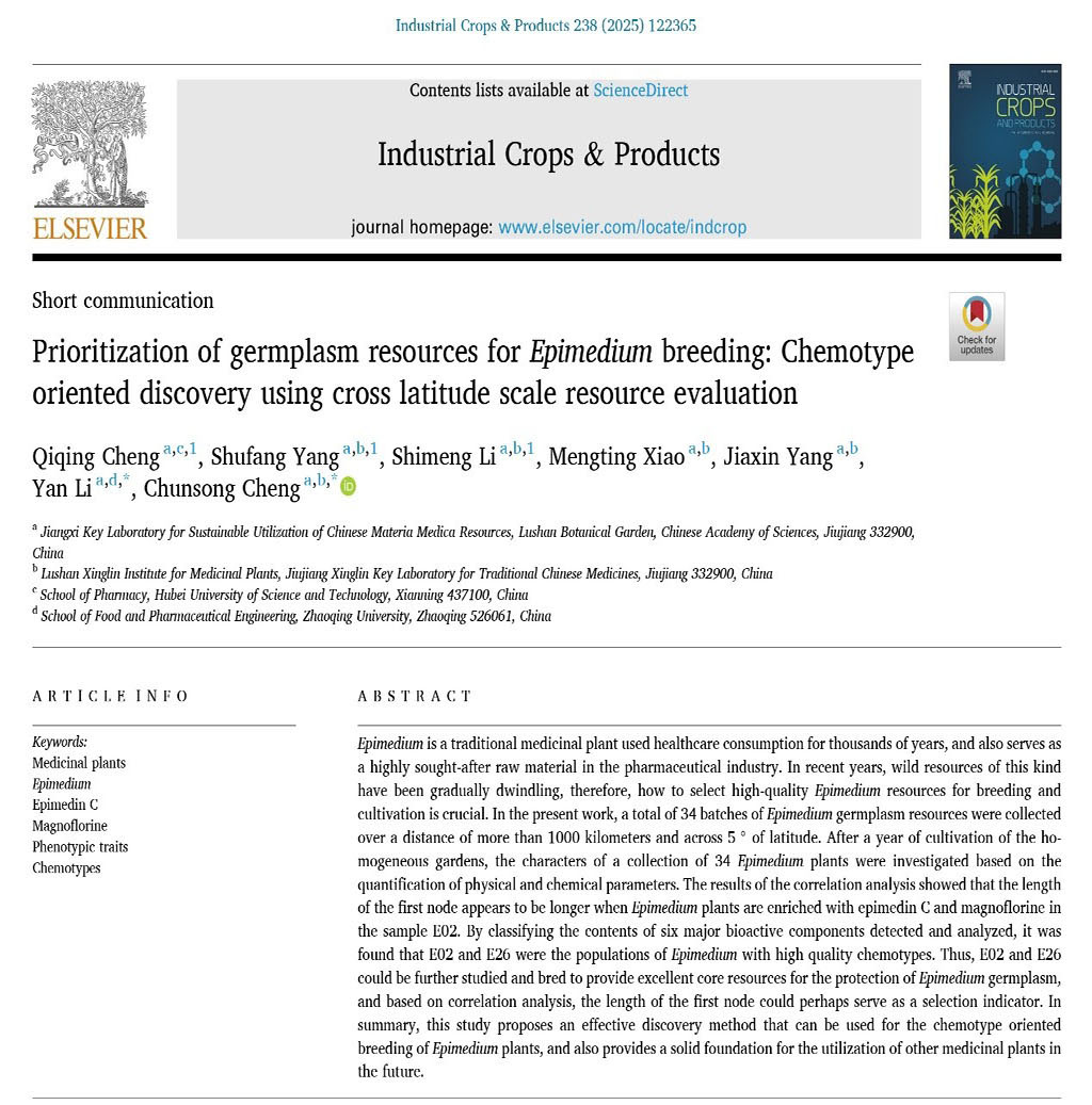 近日,江西省、中国科学院庐山植物园程春松博士团队在药用植物定向育种领域取得重大突破。该团队历时四年,通过跨纬度资源收集、同质园栽培和多维度分析,成功建立淫羊藿化学型定向选育体系,筛选出 E02、E26 两个优质化学型种质资源,为解决药用植物 "按症选种" 难题提供了全新方案。相关研究成果日前已发表于中科院一区国际权威期刊 《Industrial Crops & Products》。