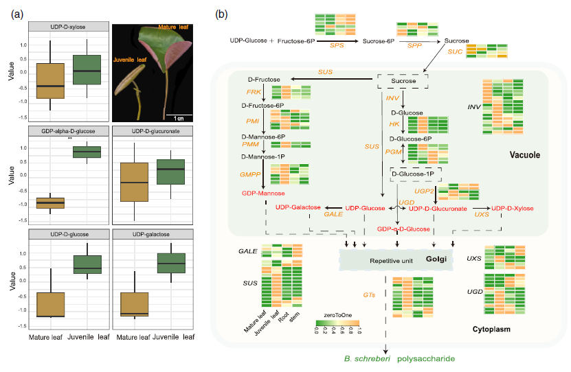 · 黏胶质合成机制: 研究首次解析了莼菜幼叶表面“果冻状”黏胶质的合成路径。发现其采用独特的能量分配模式:成熟浮水叶通过光合作用生产蔗糖,经SUC转运蛋白输送至水下幼叶,转化为前体GDP-葡萄糖,最终由糖基转移酶催化合成富含多糖的黏胶质,以抵御机械损伤与微生物侵染。