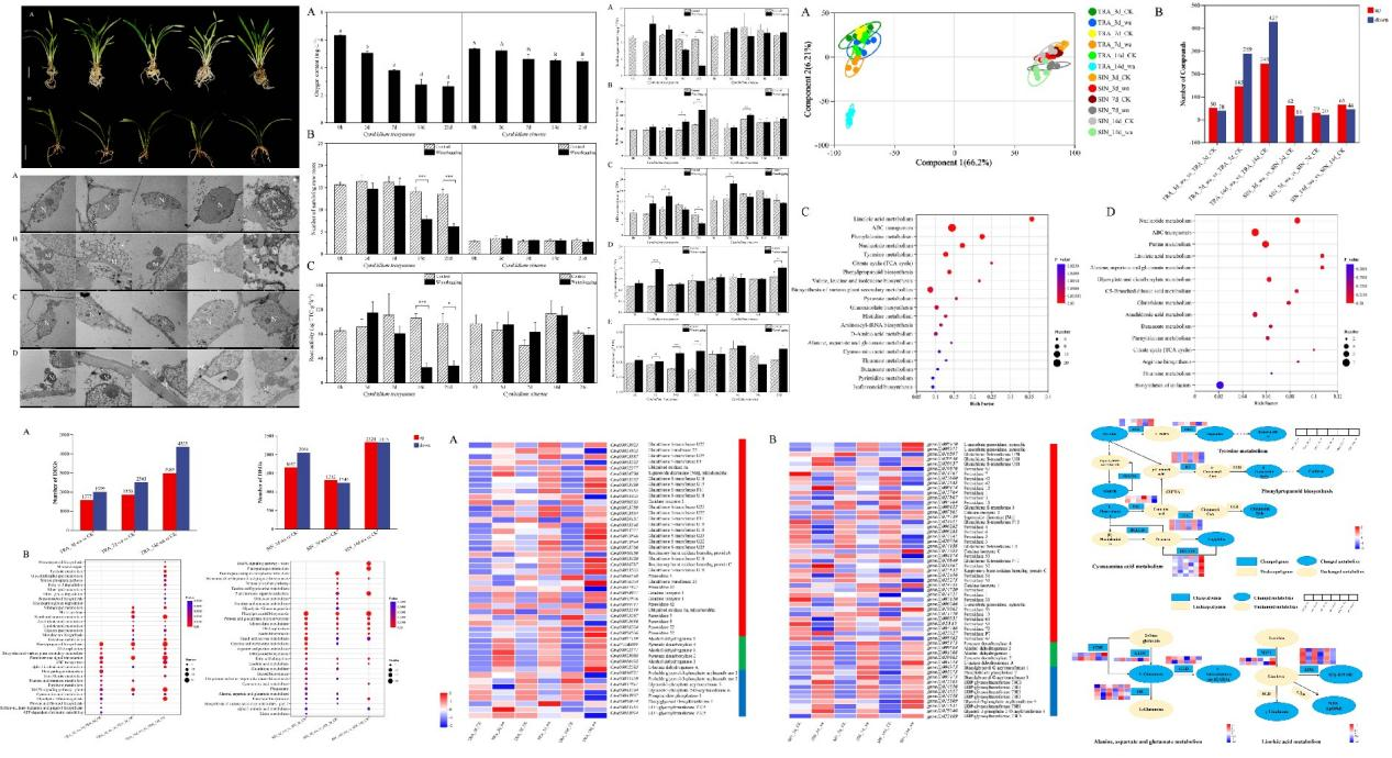研究团队以兰属附生型植物西藏虎头兰(Cymbidium tracyanum)和地生型植物墨兰(C. sinense)为研究对象,通过模拟控制实验,整合形态学、生理学、代谢组学和转录组学方法,研究了其对水涝胁迫的敏感性和响应差异,发现西藏虎头兰对水涝胁迫更敏感,表现出更严重的根际缺氧、根系活力下降、可溶性糖耗竭以及氧化损伤,并倾向于激活次生代谢途径,大量合成防御化合物。这种高投入的“防御导向型”策略虽然可能增强短期抗逆性,却因大量消耗资源而加剧了能量危机,最终导致生理机能崩溃。相反,墨兰则通过“稳态维持型”策略,优先积累脂类等初级代谢产物,有效维持能量供应、氧化还原平衡和膜结构稳定,表现出更强的耐涝性。相关成果以A multi-omics comparative analysis reveals differential responses of epiphytic and terrestrial orchids in Cymbidium to waterlogging为题发表于Environmental and Experimental Botany(DOI: 10.1016/j.envexpbot.2025.106268)。昆明植物研究所博士研究生高天阳为论文第一作者,张石宝研究员为通讯作者,已毕业硕士研究生刘宁宇和在读博士研究生周贝蓓参与了研究工作。