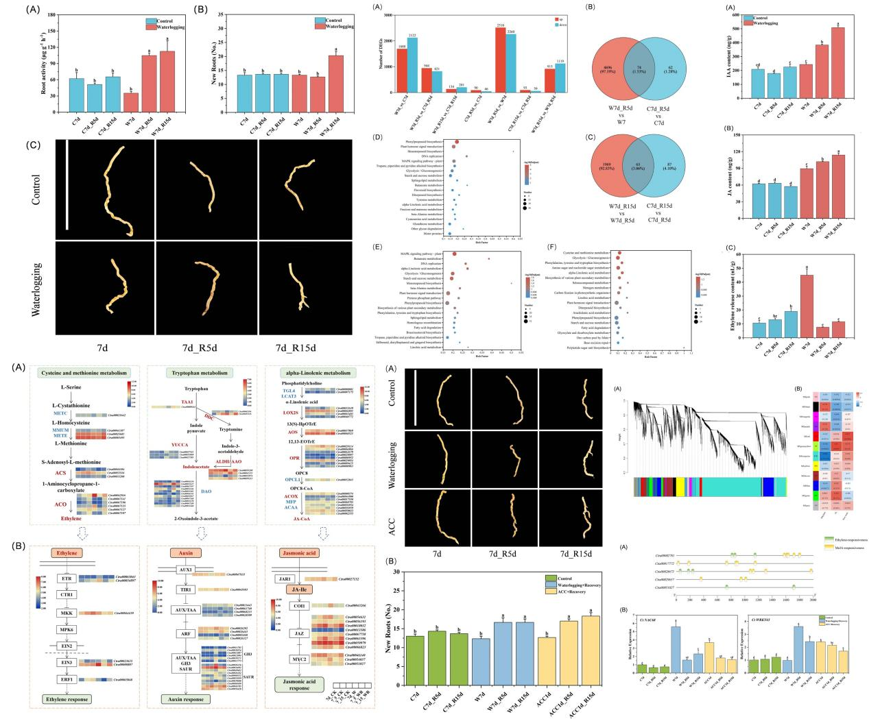水涝胁迫后的恢复能力对提高植物耐受性具有关键作用。研究团队进一步聚焦于对水涝敏感的西藏虎头兰,探究其水涝胁迫后的恢复机制。研究发现,西藏虎头兰在水涝后恢复过程中会被诱导形成大量侧根,这与其根系功能修复和活力恢复同步。转录组分析和植物激素检测表明,水涝期积累的乙烯在恢复初期发挥了早期信号作用。通过外源施加乙烯前体ACC实验证实,乙烯能够直接诱导西藏虎头兰形成侧根,并同时激活茉莉酸信号转导途径。加权基因共表达网络分析进一步锁定 CtNAC68 和 CtWRKY65 两个关键转录因子作为乙烯-茉莉酸信号交叉对话的核心枢纽,调控侧根发育相关基因的表达。这一发现首次在附生型兰花中揭示了水涝后通过乙烯-茉莉酸信号通路协同驱动侧根形成的适应机制,为理解其生态适应提供了新视角。相关成果以Ethylene promotes lateral root formation following waterlogging in an epiphytic orchid,Cymbidium tracyanum为题发表于Plant Physiology and Biochemistry(DOI: 10.1016/j.plaphy.2025.110575)。昆明植物研究所博士研究生高天阳和已毕业硕士研究生刘宁宇为论文第一作者,张石宝研究员为通讯作者,博士后涂梦玲和硕士研究生罗海翠参与了研究工作。