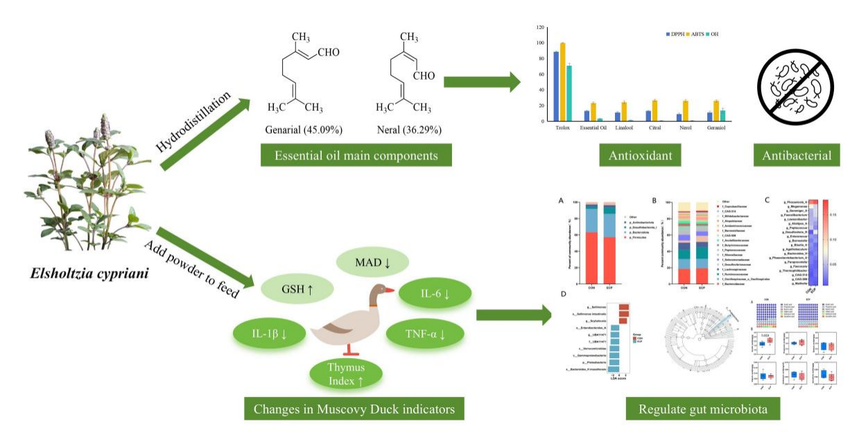 野草香(Elsholtzia cypriani)作为一种传统的药食两用芳香植物,富含以柠檬醛为主的挥发物,以及黄酮、酚类等非挥发成分,具有显著的抗菌、抗氧化及抗炎生物活性。然而,关于其作为饲料添加剂对家禽,特别是番鸭的系统性功效评价与作用机制研究尚属空白。中国科学院昆明植物研究所芳香与甜味资源植物研发专题组与合作者开展了日粮中添加野草香草粉对番鸭影响的相关研究。