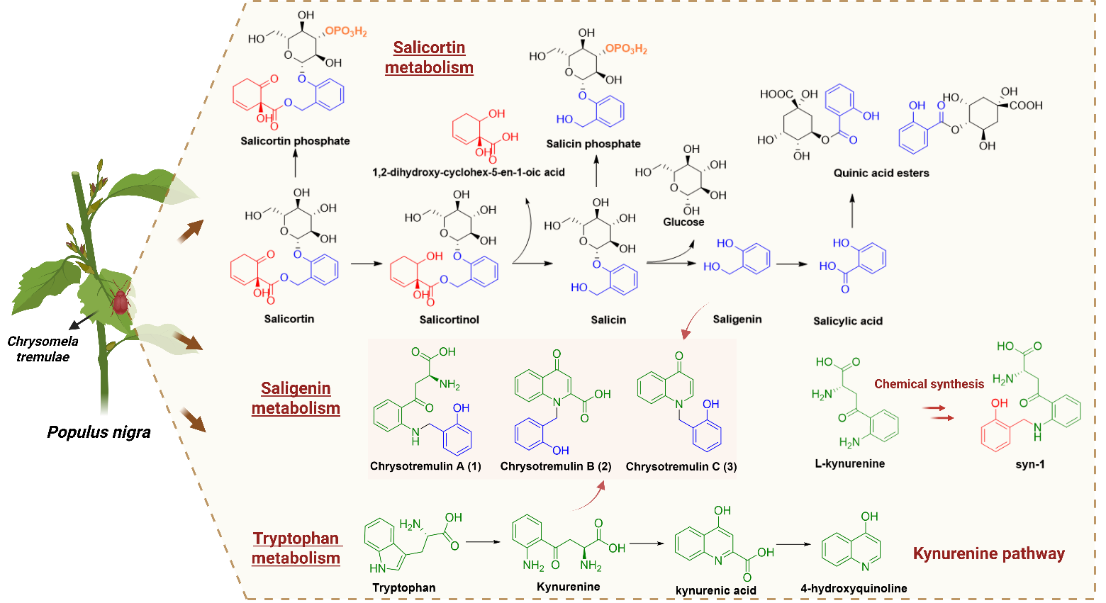为揭示其背后的机制,中国科学院昆明植物研究所植物化学与天然药物全国重点实验室彭惺蓉副研究员与德国马普化学生态所团队合作,以杨叶甲为模型系统,采用同位素标记结合靶向/非靶向LC-MS代谢组学,并辅以结构表征的方法,追踪并确证salicortin的代谢途径。在此过程中,首次发现了杨叶甲能够利用必需氨基酸色氨酸及其分解产物(包括犬尿氨酸、犬尿酸和4-羟基喹啉)与水杨苷代谢物水杨醇形成新型结合物,最终通过虫粪排出体外。水杨醇及其结合物对杨叶甲无毒害作用,类似代谢途径在其他杨树食草昆虫中也得到证实。尤其是在亲缘关系较远的杨树植食昆虫Laothoe populi和Saperda carcharias体内检测到结合物,这表明了色氨酸辅助解毒机制的趋同进化。而鞘翅目的Saperda carcharias与鳞翅目的Laothoe populi在进化上已分离超过3亿年,这一发现表明,这一代谢性状是独立起源的。