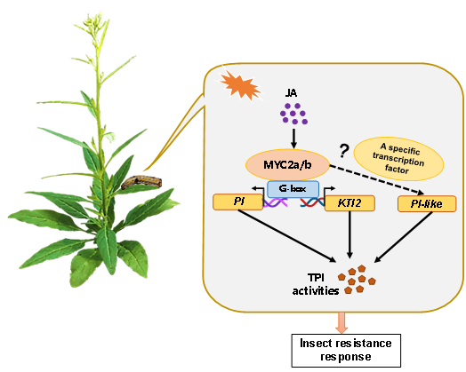 前期研究发现,植物激素茉莉酸(JA)在植物抵御昆虫取食中发挥着核心作用,它可以极显著提高植物叶片中的胰蛋白酶蛋白酶抑制剂活性。但是JA调控胰蛋白酶蛋白酶抑制剂基因表达的分子机制仍然未知。