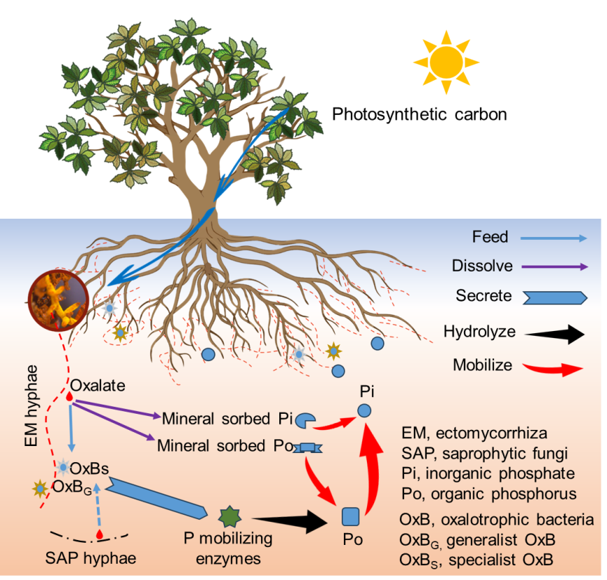 宿主植物提供光合固碳给共生真菌,真菌菌丝分泌草酸,草酸被专性和兼性草酸氧化菌作为碳源利用,草酸氧化菌分泌磷酸酶矿化有机磷,增加土壤生物可利用磷浓度,进而被菌根际细菌、真菌乃至植物根系吸收。该模式反映了植物-真菌-细菌三方互作促进土壤磷吸收利用的作用机制;之前的经典理论认为,外生菌根菌丝分泌草酸主要通过化学反应活化土壤矿物质吸附的磷,该研究为理解土壤有机磷矿化提供了新视角。