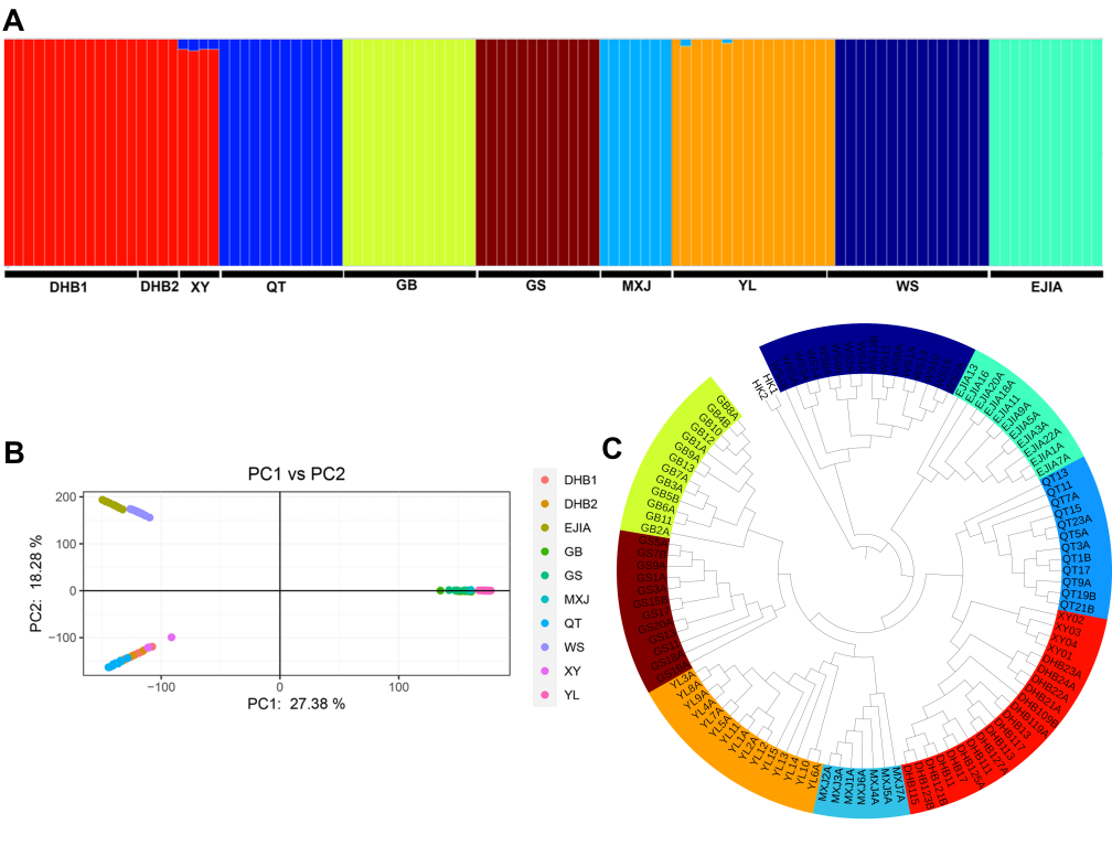图2(A) 种群结构、基于全部位点的 (B) PCA 聚类和 (C) ML 树
