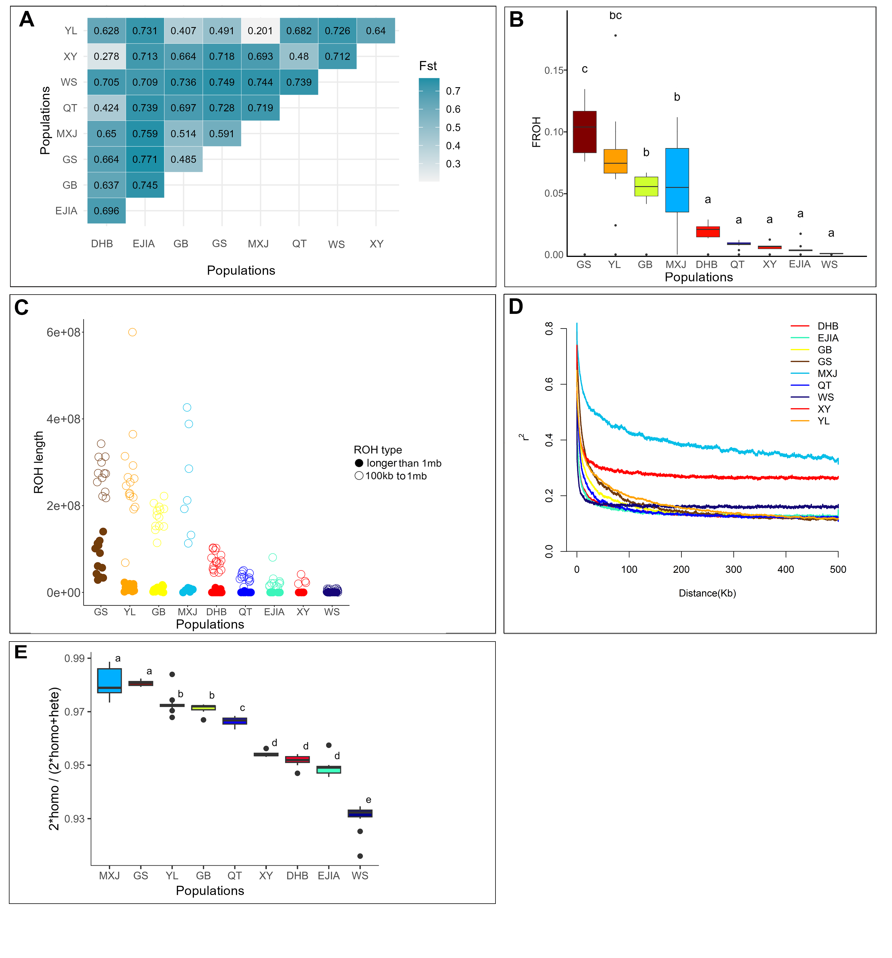 图3(A) 种群遗传分化、(B) 纯合性片段比例、(C) 纯合子片段的大小分布、(D) 全基因组连锁不平衡(LD)的衰减、(E) 群体水平的遗传负荷,纯合衍生有害突变的比例