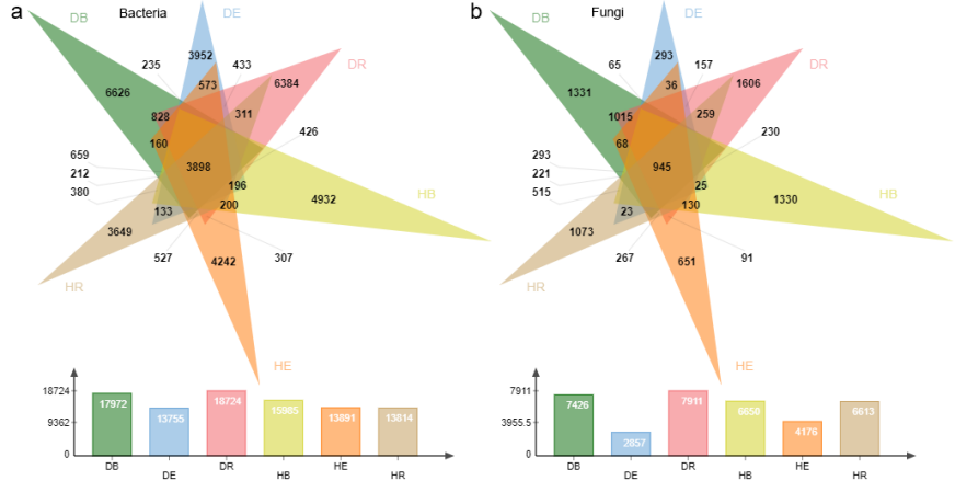 图6 维恩图展示了样本中细菌(a)和真菌(b)OTU的重叠情况