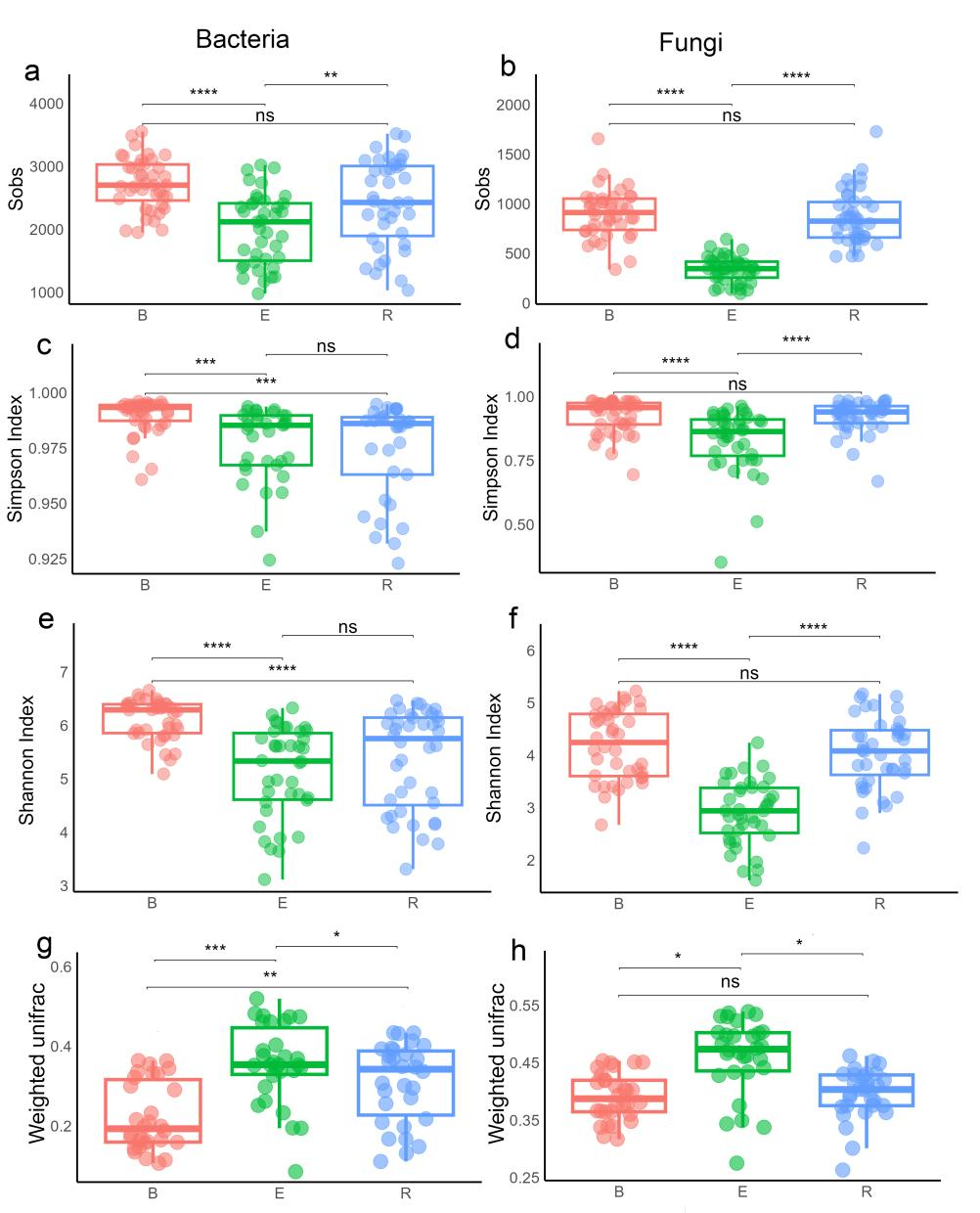 图7 不同组织微生物群落的α多样性和β多样性:细菌(a)和真菌(b)群落的Sobs多样性指数;细菌(c)和真菌(d)群落的Simpson多样性指数;细菌(e)和真菌(f)群落的Shannon多样性指数;基于加权UniFrac距离矩阵的细菌(g)和真菌(h)群落的Beta多样性