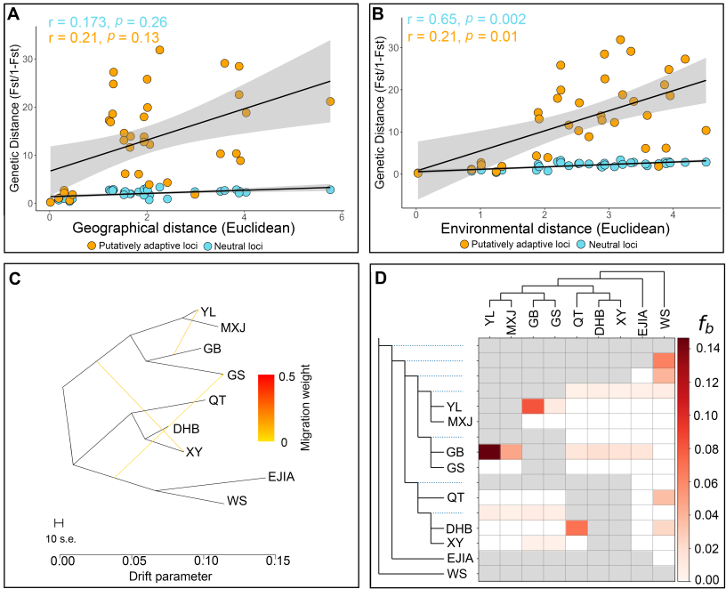 图4(A) 中性位点和适应性位点的距离隔离(IBD)、(B) 环境隔离(IBE)、(C) 种群关系与推断的基因流、(D) Dsuite热图显示种群间的基因渐渗
