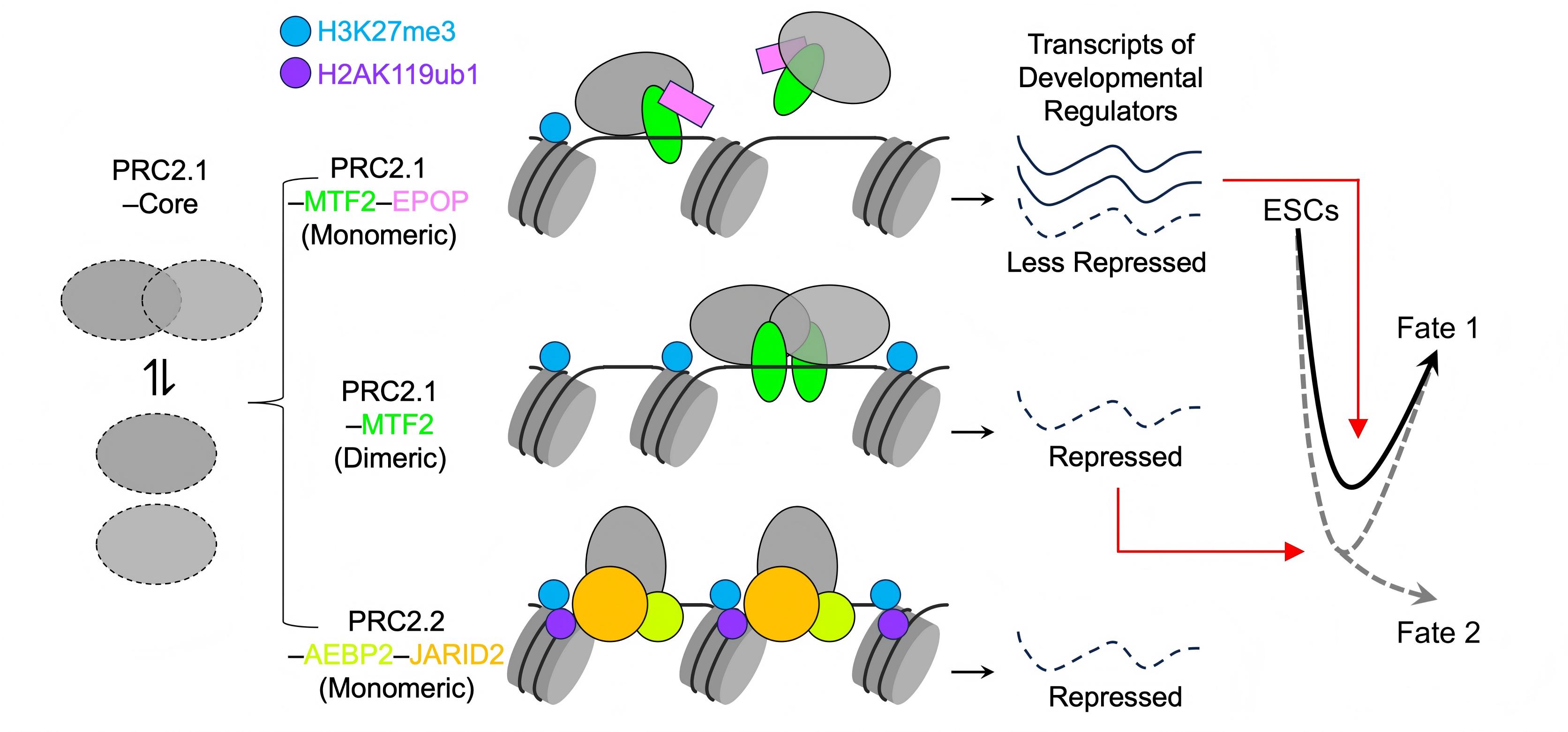 晶体结构显示EPOP直接竞争性结合PRC2.1的核心互作界面,特异性破坏PHF19介导的二聚化稳定结构,促使PRC2.1从具有高染色质亲和力的二聚态向低亲和力单体态转变。在干细胞分化模型中,EPOP功能缺失导致全基因组范围内PRC2.1染色质占据显著增强,并引发关键发育调控基因位点的异常沉默。