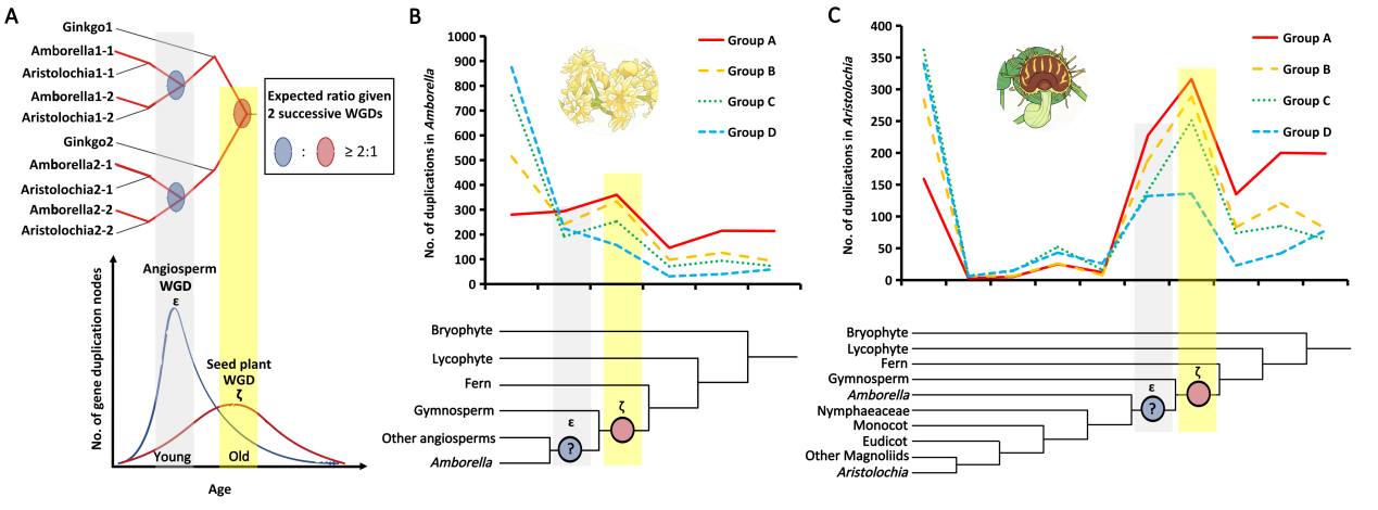 被子植物又称开花植物,是种子植物中最为繁盛的一个类群,其起源与演化长期以来是植物进化研究的核心问题之一。长期以来,WGD(全基因组加倍 / 多倍化)被认为在种子植物和被子植物的起源与性状演化中扮演关键角色。但因WGD遗传痕迹易被后续二倍化过程中的基因丢失、染色体重排和基因同义替换饱和所掩盖,追溯这些远古多倍化事件面临技术挑战。2011年,Jiao等学者基于单子叶植物和双子叶植物分化前基因重复年龄的双峰分布,提出种子植物和被子植物祖先各经历了一次独立的WGD事件,并命名为ζ事件和ε事件。然而,2017年Ruprecht等分析发现,该双峰信号可能源于分子定年分析中,仅校准了代表单/双子叶植物分化的两个同源节点之一,而另一个节点未被校准,而非真实的演化事件,使得相关争议持续未解。
