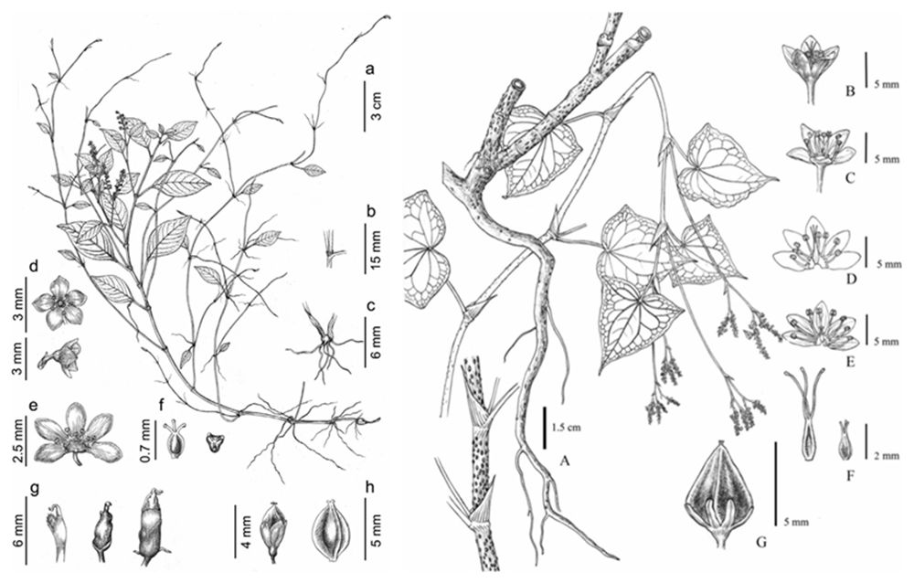 中国科学院西双版纳热带植物园(以下简称“版纳植物园”)植物分类和保护研究组在开展蓼科植物分类学研究过程中,先后描述发表蓼科两个新种,分别是冰岛蓼属(Koenigia L.)的墨脱冰岛蓼K. medogensis Bo Li(图1左)和荞麦属(Fagopyrum Mill.)的石灰山野荞麦F. calcicola Bo Li, M.L.Zhou & Y.H.Tan(图1右)。