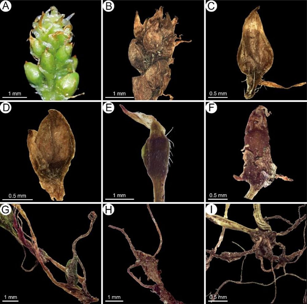 图 3 .墨脱冰岛蓼的珠芽结构A-D花序顶端的珠芽;E-I匍匐茎顶端珠芽的生根过程(不同发育阶段)。