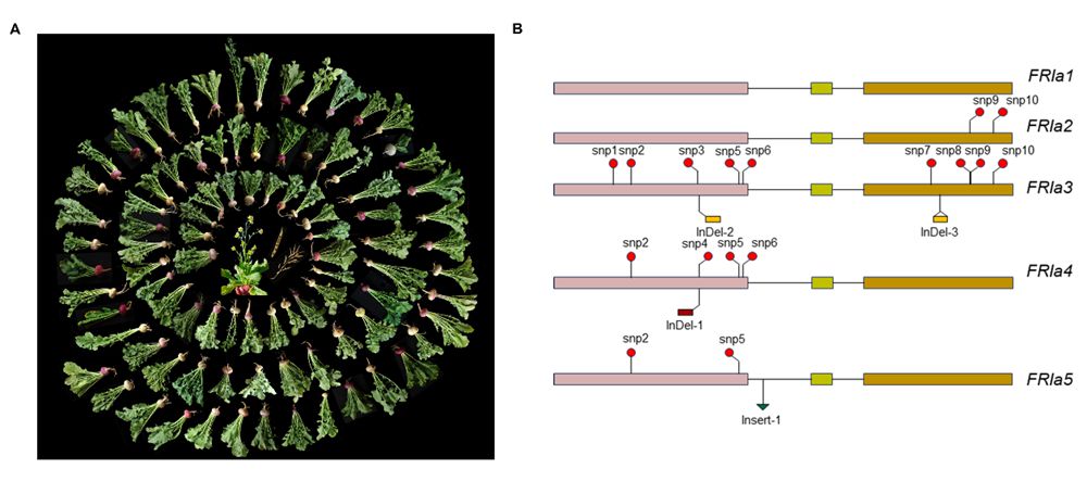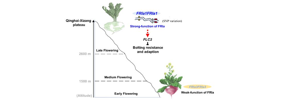 为探究不同蔓菁种质资源间开花时间的变化及其潜在遗传机制,中国科学院西双版纳热带植物园(以下简称“版纳植物园”)研究人员对来自世界各地的104份地方种质资源进行开花时间分析。来自不同地理区域的蔓菁开花时间表现出显著差异,这与它们生长地区的海拔和气候温度密切相关。研究进一步分析了蔓菁FRIa和FLC2基因的遗传变异及其对开花时间差异的贡献。研究结果表明,开花时间关键调控基因FRIa变异在蔓菁开花时间的适应性性状上,特别是维持高海拔蔓菁晚花方面发挥着关键作用。同时,特异性单核苷酸多态性(SNP)变异对高原FRIa基因的功能强化起作用。研究结果揭示了蔓菁开花时间沿海拔梯度的适应机制,为阐明FRIa如何促进蔓菁在不同海拔条件下适时开花提供了新的见解,也为蔓菁FRIa强功能变异驱动海拔梯度下的开花时间适应性演化提供了分子基础。