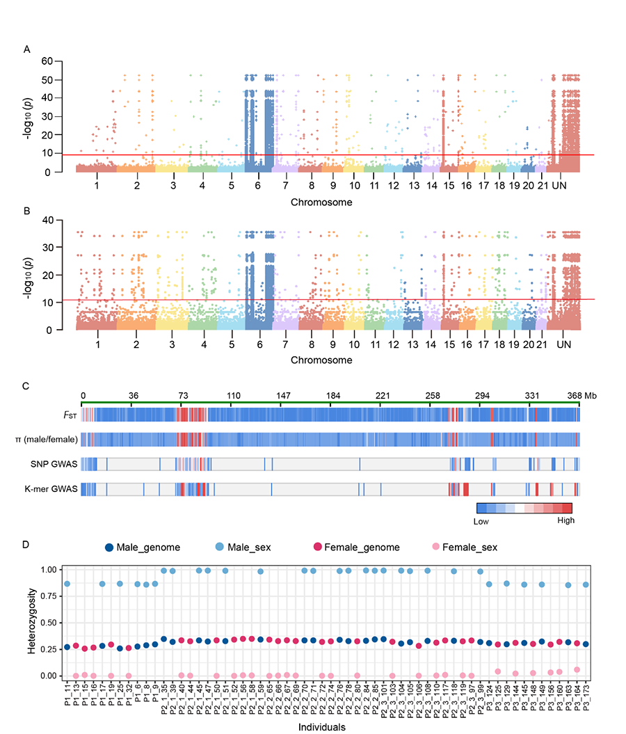 为探讨上述问题,国家植物园(南园)汪小全研究团队利用已经测序的百岁兰基因组(约6.8 Gb),对该物种分布于纳米布沙漠南端地理距离很近的5个群体130个个体进行了全基因组重测序,开展了群体基因组比较和环境因子等综合分析(图1)。研究显示,基因组在这些群体间发生了显著分化,地理隔离是重要驱动力,其通过限制基因流直接导致了谱系间的遗传分化,环境因素(尤其是土壤异质性)在群体分化中也具有重要作用。同时,百岁兰以虫媒传粉为主、传粉动物的飞行力弱,并靠水力协助扩散种子。这些特性也限制了群体间的基因交流,加强了群体间遗传分化。基因组变异检测发现,群体间的基因组分化景观呈现高度异质性,基因组岛屿广泛分布于整个基因组,这主要归因于祖先多态的差异分选和搭车效应。此外,通过对30株雄性和30株雌性百岁兰个体的全基因组关联分析,研究人员发现其性别决定系统为XY型,性别连锁区域位于6号染色体的72.04-92.82 Mb(图2)。有趣的是,在该区域中并未发现已知在其他裸子植物(如苏铁、银杏)性别决定中起关键作用的MADS-box基因家族成员。百岁兰科的XY型性别决定系统这一发现,结合基部裸子植物类群(苏铁、银杏)同样为XY型性别决定系统等证据,暗示着裸子植物的共同祖先可能是XY型性别决定系统。