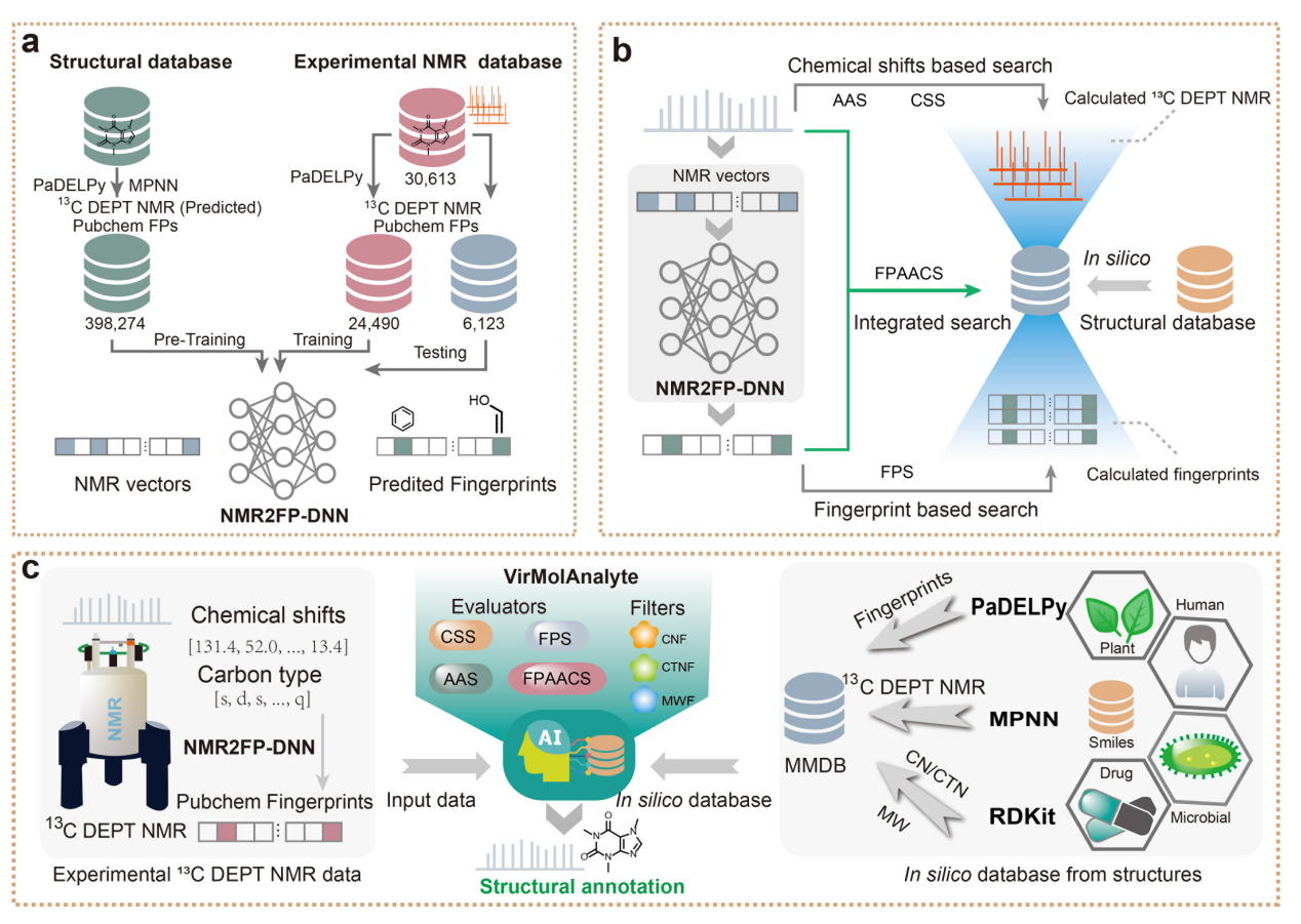 图2 基于“筛选-评估”策略的 VirMolAnalyte。(a) NMR2FP-DNN 模型的训练流程,用于从13C DEPT NMR 谱中预测分子指纹;(b) VirMolAnalyte 中各评估器的基本原理;(c) VirMolAnalyte 的整体工作流程:NMR2FP-DNN 根据输入的13C DEPT NMR 数据预测 PubChem 分子指纹,预测指纹与化学位移信息共同作为输入,通过“筛选–评估”策略在 in silico 数据库中完成结构注释。