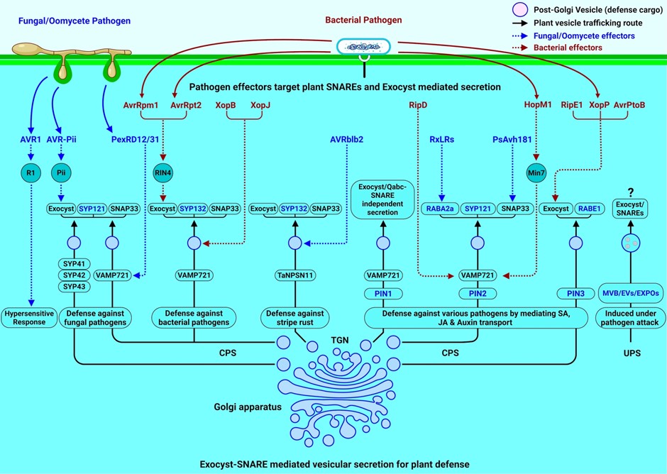 植物分泌系统如同一套精密的物流网络,既维持细胞稳态,又能在病原侵染时迅速动员防御反应。该系统的核心是可溶性 N-乙基马来酰亚胺敏感因子附着蛋白受体(SNARE)蛋白,它们催化膜融合;以及由八个亚基组成的外排体(exocyst)复合物,负责将源自反式高尔基体的囊泡锚定到特定的质膜区域。这两套机制并非各自独立运作,而是作为一个相互依赖的功能模块协同工作:外排体促进囊泡系留并推动 SNARE 复合体的组装,而 SNARE 蛋白反过来稳定外排体的定位与活性。这种协同作用确保免疫相关货物——包括致病相关蛋白、胼胝质合酶、转运蛋白以及特化代谢物——被精准递送至病原攻击位点。然而,病原体会分泌效应因子以干扰外排体–SNARE 的相互作用,从而削弱这些防御补给线。