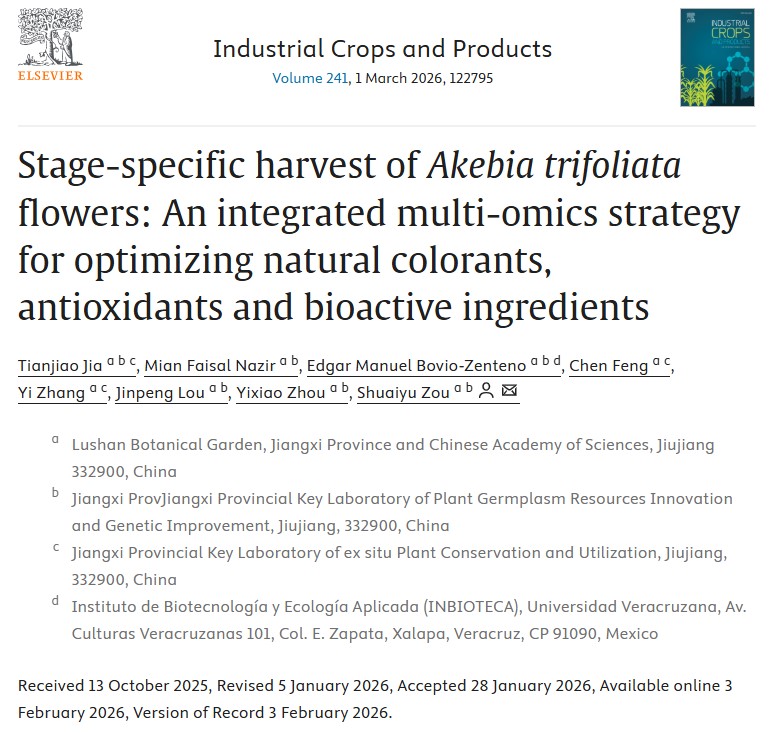 近日,庐山植物园特色果树资源驯化与改良研究组在国际知名期刊《Industrial Crops & Products》上发表最新研究成果,论文题为“Stage-specific harvest of Akebia trifoliata flowers: An integrated multi-omics strategy for optimizing natural colorants, antioxidants and bioactive ingredients”。该研究系统揭示了三叶木通花在不同开花阶段的代谢物动态变化规律,首次提出基于发育阶段的“精确采收”策略,为其多功能高值化开发提供了重要科学依据。