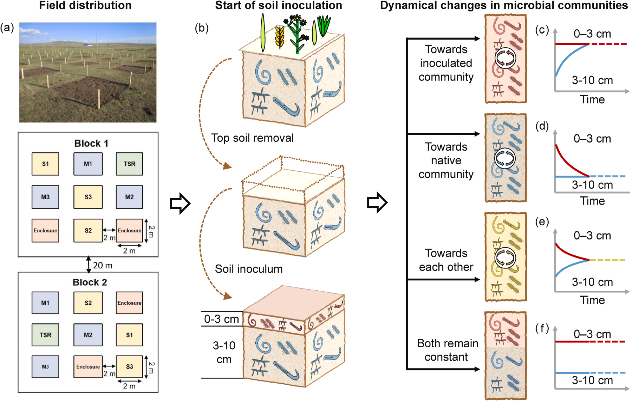 土壤生物是驱动养分循环等关键生态过程的核心要素。基于"植物-土壤反馈"理论,土壤接种(soil inoculation)通过引入健康供体土壤中的生物群落,在受体环境中实现定殖并与植物形成正反馈,从而加速退化生态系统的恢复进程。然而,在庞大的土著生物群落面前,外源接种的生物能否重塑深层土壤的生物群落结构?这一科学问题还亟待解答。